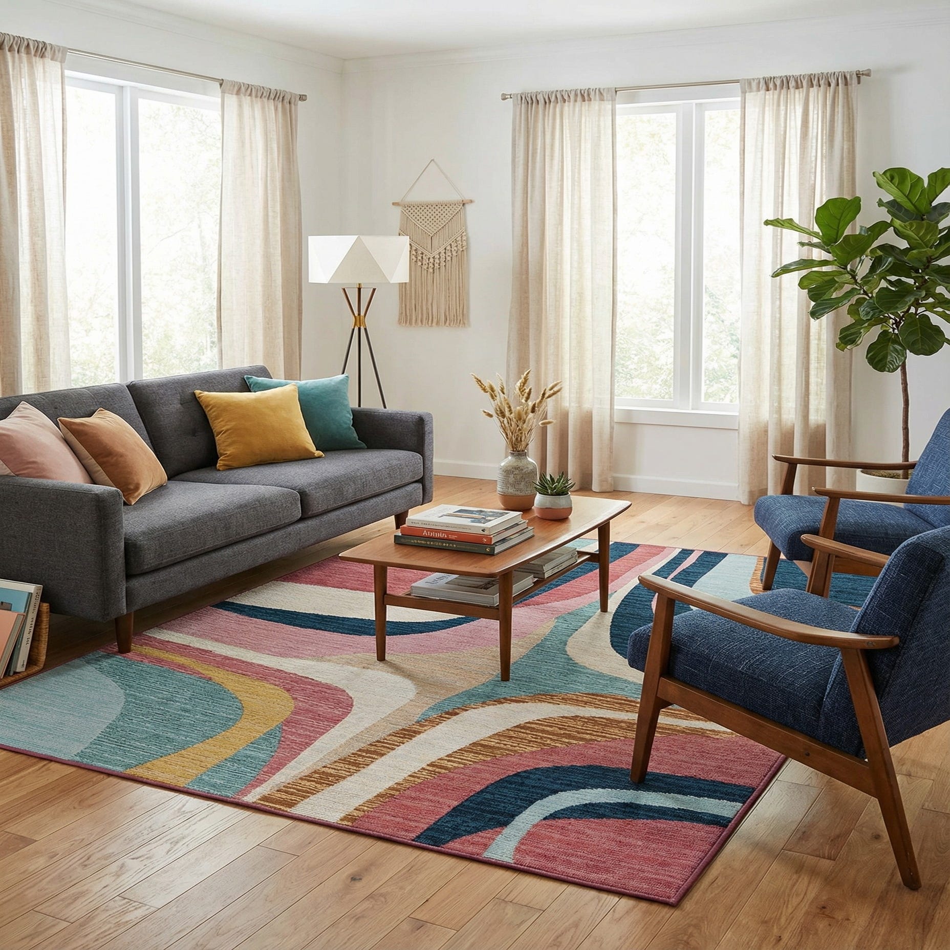 A bold, abstract pattern of sweeping, curved bands creates a lively midcentury-modern look across a multi-hued background. Layers of navy and light blue meet teal and ivory, while pink and red arcs balance warmer touches of gold and yellow. Subtle gray and green accents thread through the design, giving depth and movement to the composition. Machine made from 100% polypropylene, the rug has a low-profile, tightly woven texture with a slight ribbed feel that sits firm underfoot and holds its shape.