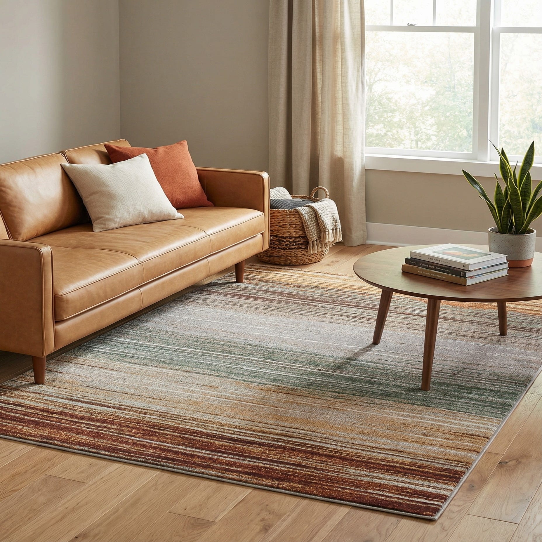 A 4x6 rectangular multi-colored modern rug with horizontal stripes in shades of brown, orange, green, and grey.
