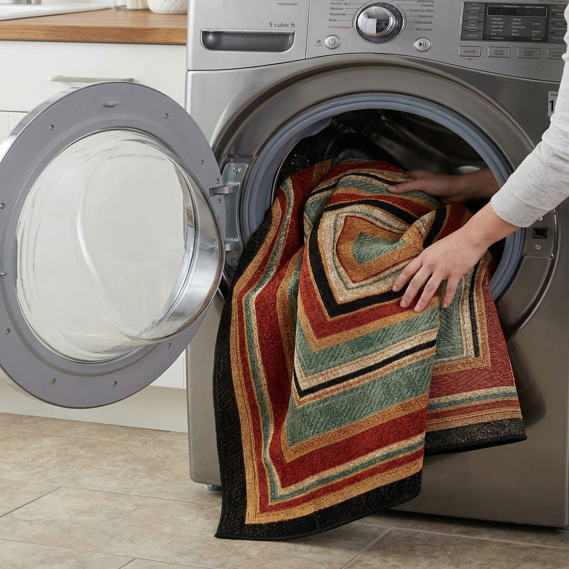 This piece works well on a covered patio or sunroom as a colorful anchor beneath a bistro set, or inside an entryway to introduce warm, earthy tones the moment guests arrive. It pairs naturally with natural wood furniture, black metal accents, terracotta planters and ivory textiles, and complements mid-century modern, southwestern or layered bohemian interiors.