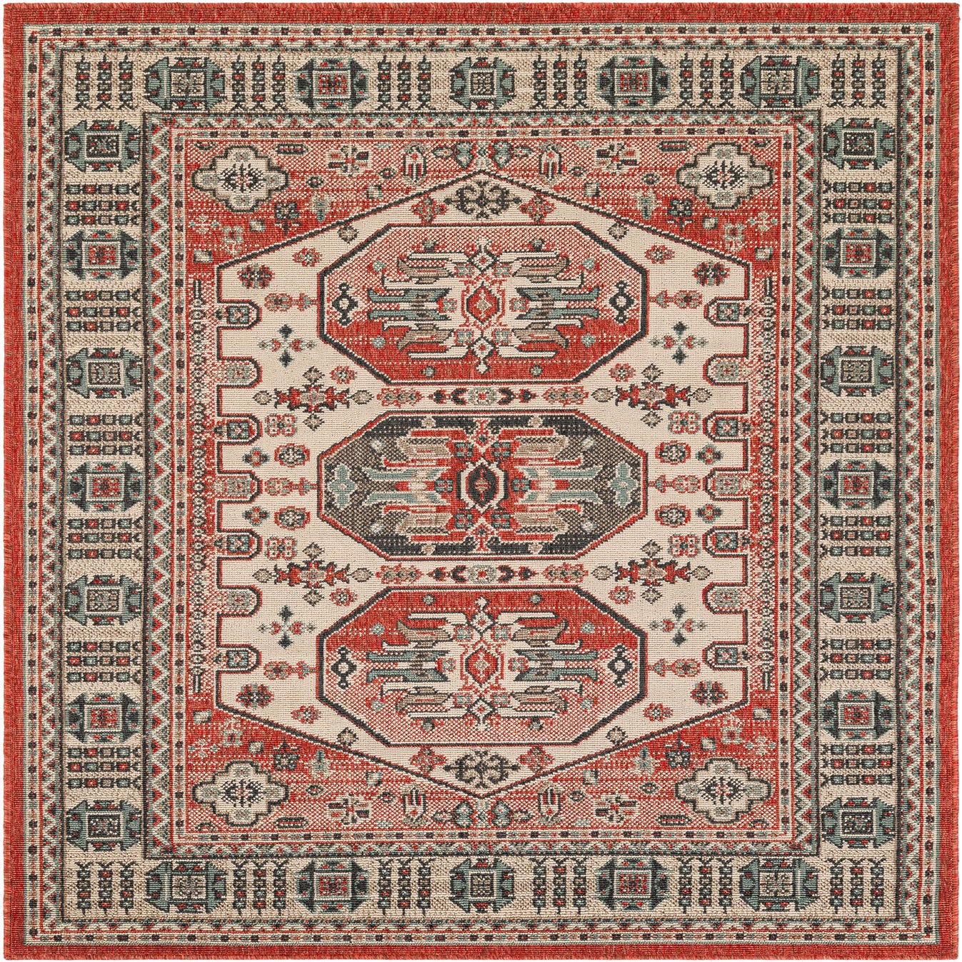 A 4x6 rectangular indoor/outdoor rug with a multi-colored modern pattern featuring shades of red, beige, and teal, perfect for a patio or living room.