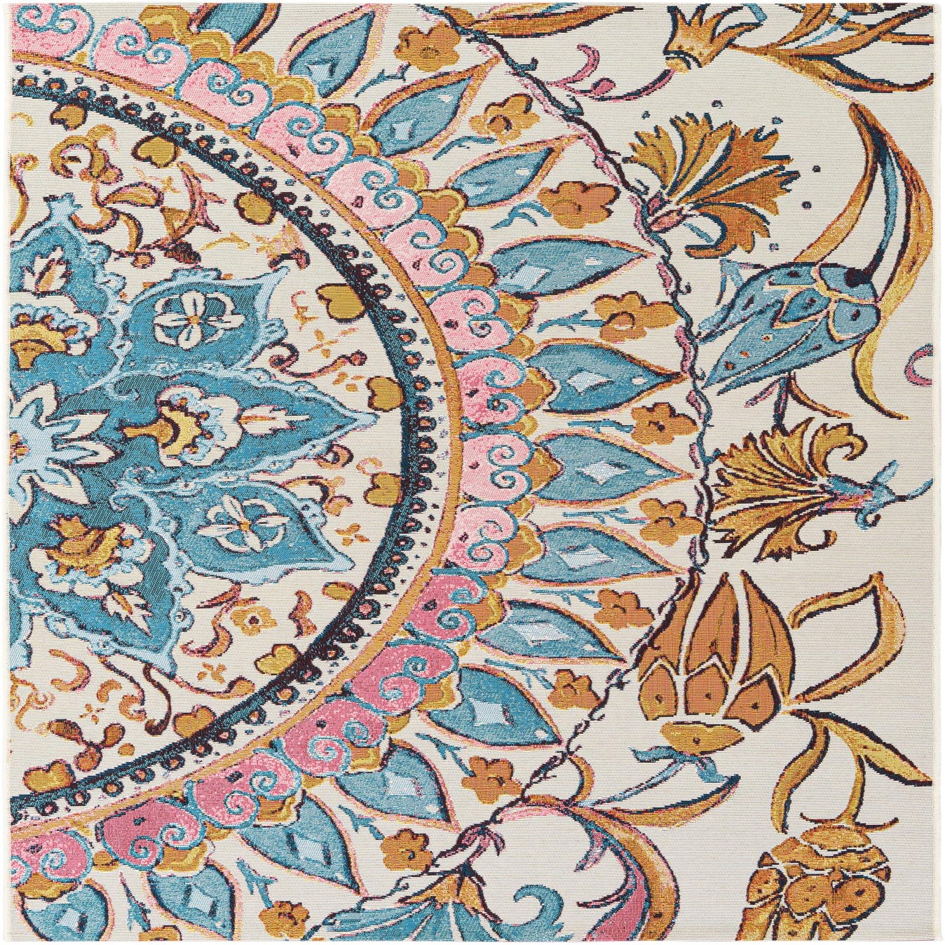 A close-up of a multi-colored modern flatweave rug featuring a vibrant medallion pattern in teal, pink, and gold on a cream background.