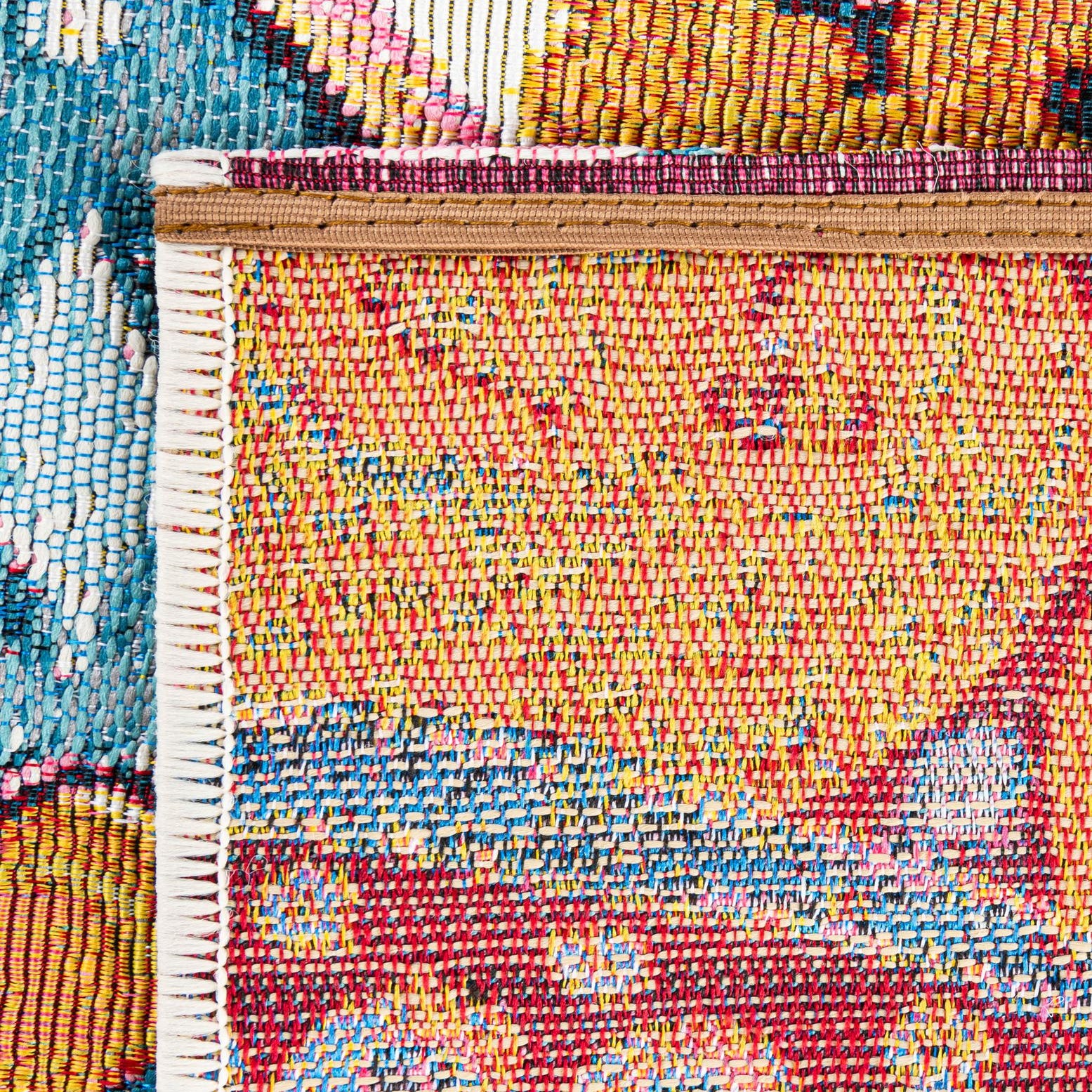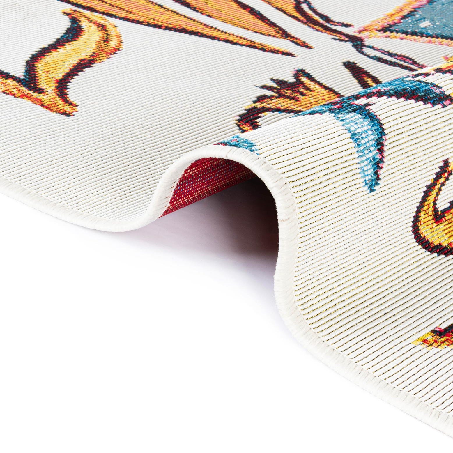This rug fits well in covered outdoor living areas as well as casual indoor settings — think a screened porch, a sunny entryway, or beneath a small dining table. It pairs naturally with weathered wood and matte black metal, rattan or wicker seating, and linens in neutral or blue tones; use gold and olive accents in pillows or planters to echo the rug’s color story and tie the space together.