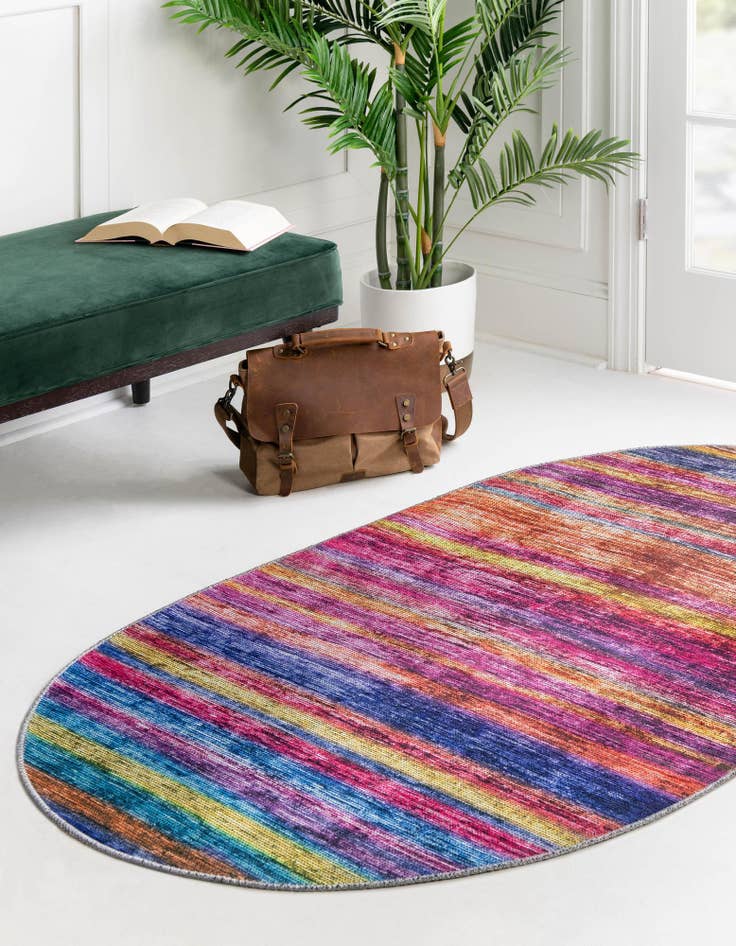 A 4' x 6' oval multi-colored modern stripe rug made from chenille, featuring vibrant horizontal bands of pink, purple, orange, and blue hues.