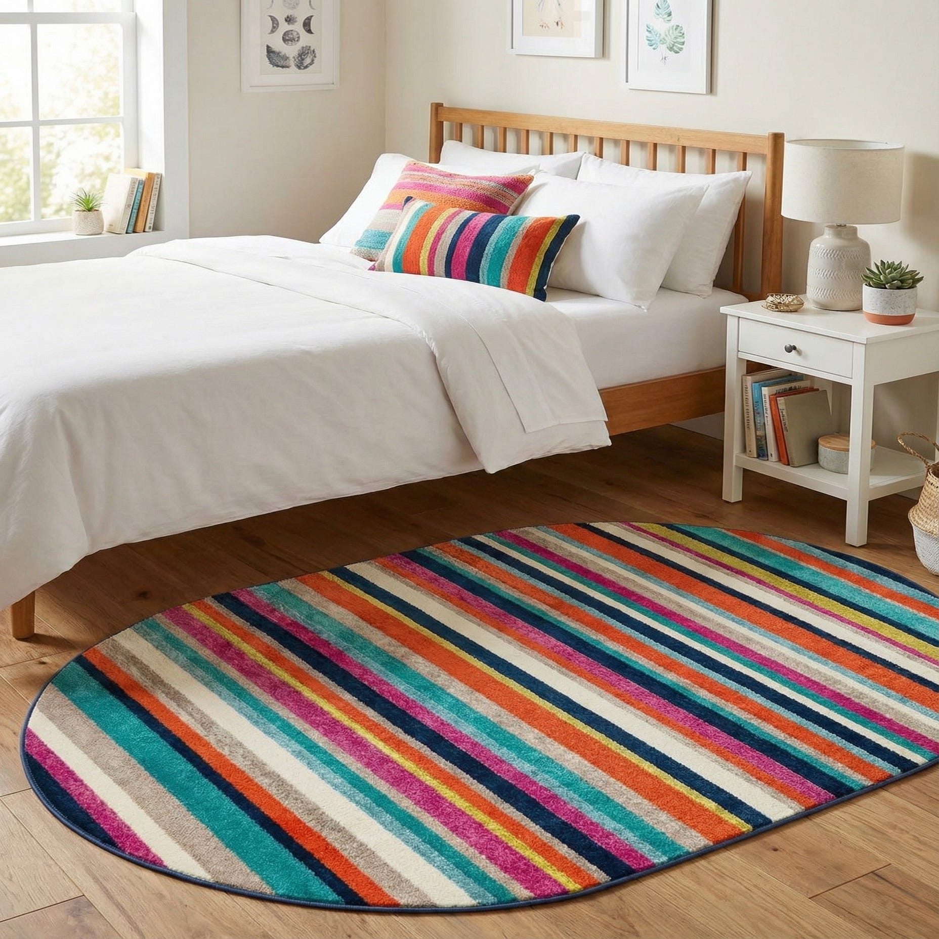 Bright, horizontal bands of color run across an oval field in a lively striped pattern that balances playful energy with clean modern lines. Navy, ivory, orange, teal, light blue, violet and soft gray alternate in varying widths to create a layered, graphic look. The dense, soft polypropylene pile offers a plush, slightly velvety hand underfoot and a defined surface that highlights each stripe’s color and texture. Machine-made from 100% polypropylene, the construction holds the pattern clearly while keeping the overall feel substantial yet comfortable.