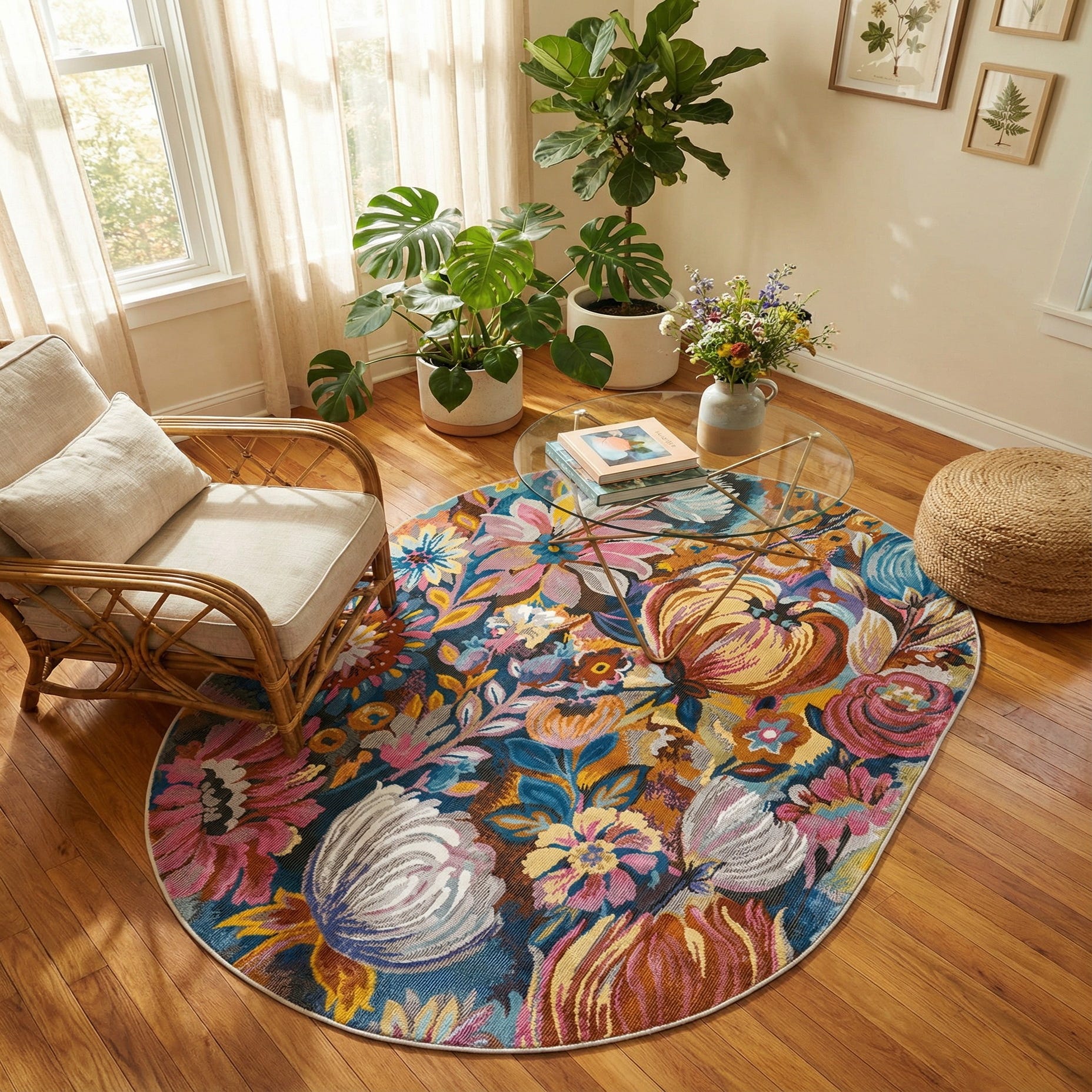 A vibrant 4'x6' oval rug with a multi-colored modern floral and tropical pattern, featuring large blooms in pink, yellow, blue, and white on a dark background.