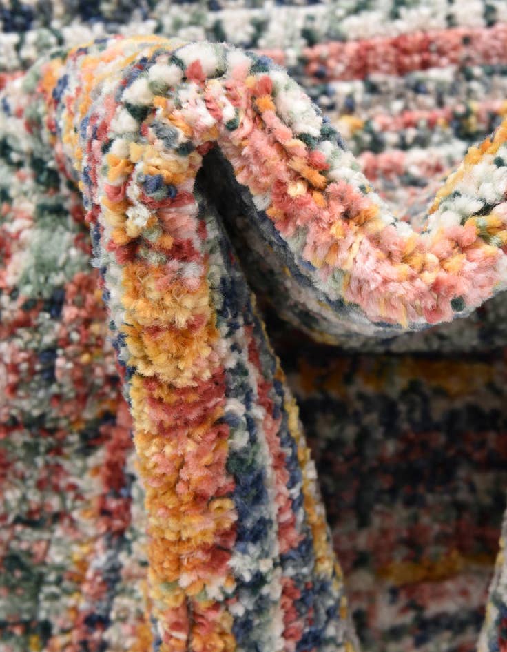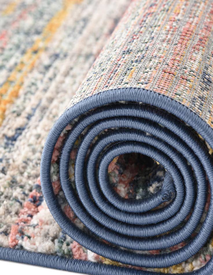 The rug's array of colors is finely dispersed in a horizontality striated pattern, providing visual interest and making it a versatile choice for a variety of decor styles. The tightly woven construction offers a smooth texture and a shed-free experience. Its stain-resistant quality ensures practicality, making it an ideal choice for high-traffic areas or dining spaces where accidental spills may occur.