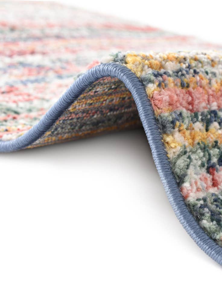 This area rug's colorful palette and contemporary styling would complement modern, eclectic, or bohemian interiors. It can serve as a statement piece in a minimally designed room or blend harmoniously in a vibrant space abundant with color. Its oval shape makes it particularly well-suited for placement under round or oval dining tables, as an accent in living rooms, or as a welcoming piece in entryways.
