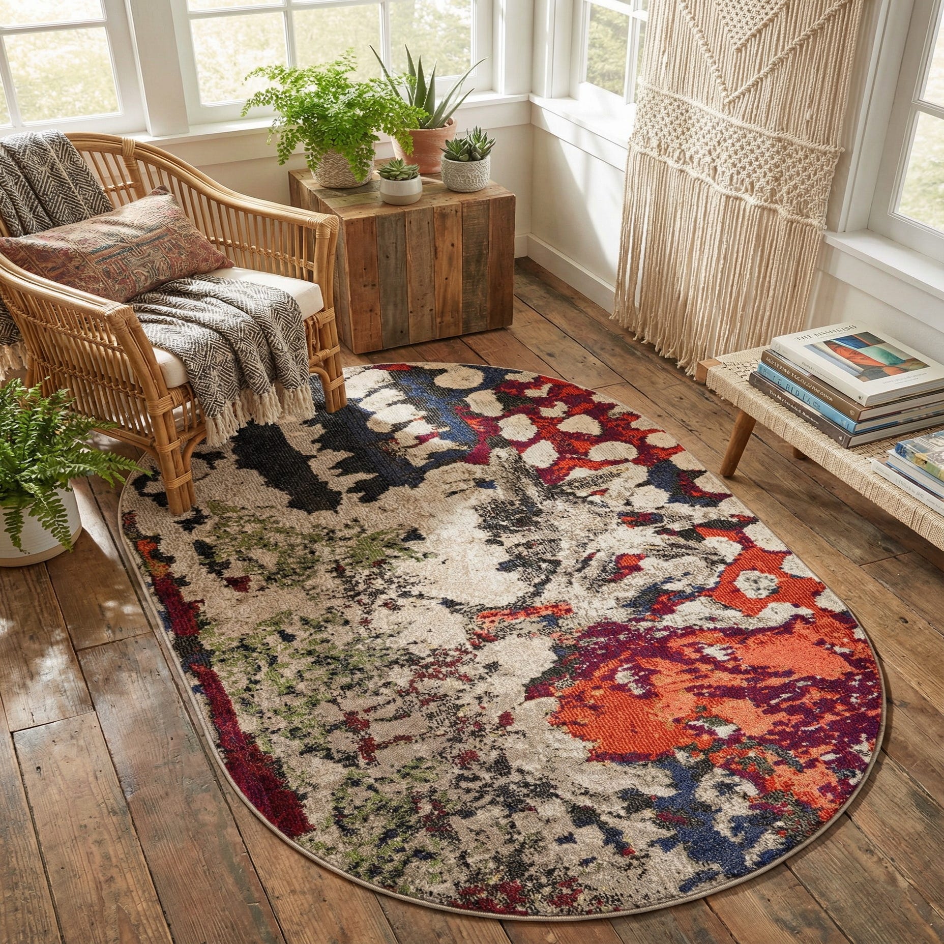 The Haerfest Collection presents this vibrant 4x6 oval area rug, crafted from 100% polypropylene for durability and easy maintenance. The rug showcases a dynamic abstract pattern, featuring a bold mix of colors that include black, gray, ivory, navy blue, red, and purple set against a multi-tone background. This blending of shades creates a stunning visual impact that is both contemporary and versatile.
