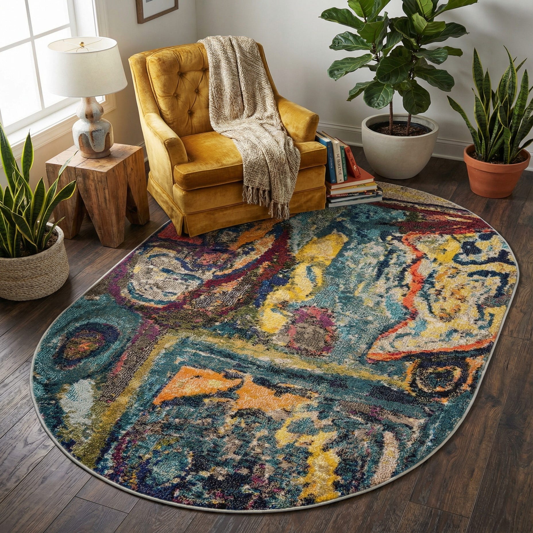 Made from 100% polypropylene, the pile has a low-profile, softly textured hand that feels comfortable underfoot and keeps the design well-defined. The oval silhouette works beautifully as an anchor in a seating area or reading nook, under a round dining table, or in an entryway to introduce color and pattern. Pair it with mid-century wood furniture for a retro-modern contrast, layered over wide-plank floors for added warmth, or use it to lift a neutral sofa and complement industrial or bohemian decor.