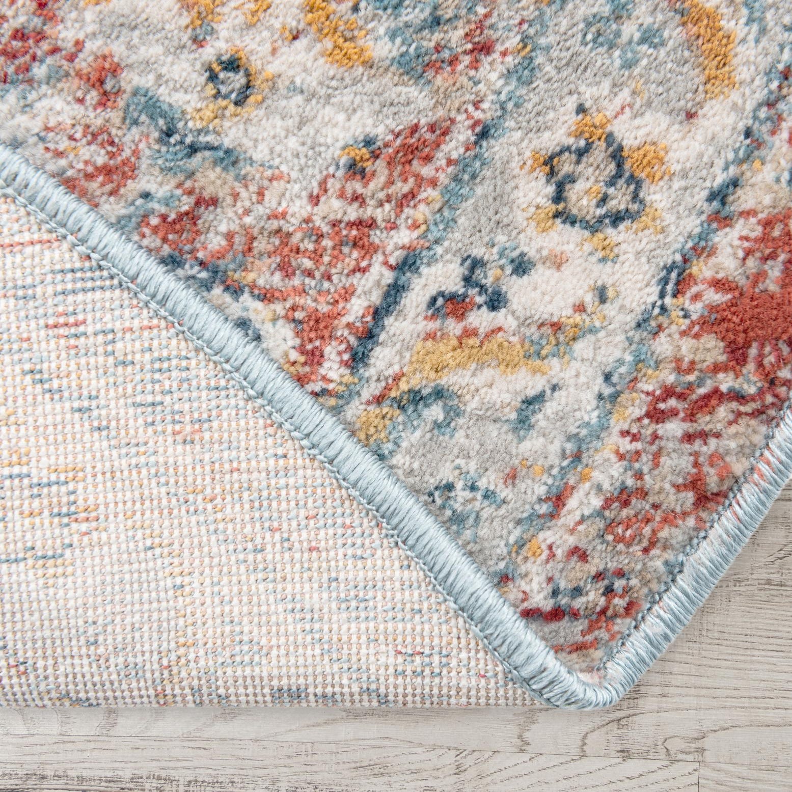 An oval medallion design blends classic Persian-inspired motifs with a faded, vintage-inspired overlay. The multi background brings together bands of blue, light blue and gray with ivory fields, while light brown, rust red and terracotta accents add depth and warmth. A deeper blue floral medallion anchors the center, surrounded by scrolling arabesques and tiny floral dots that lift subtly from the surface. The low pile has a smooth, slightly cushioned hand that highlights the pattern’s raised and recessed details when you run your fingers across it.