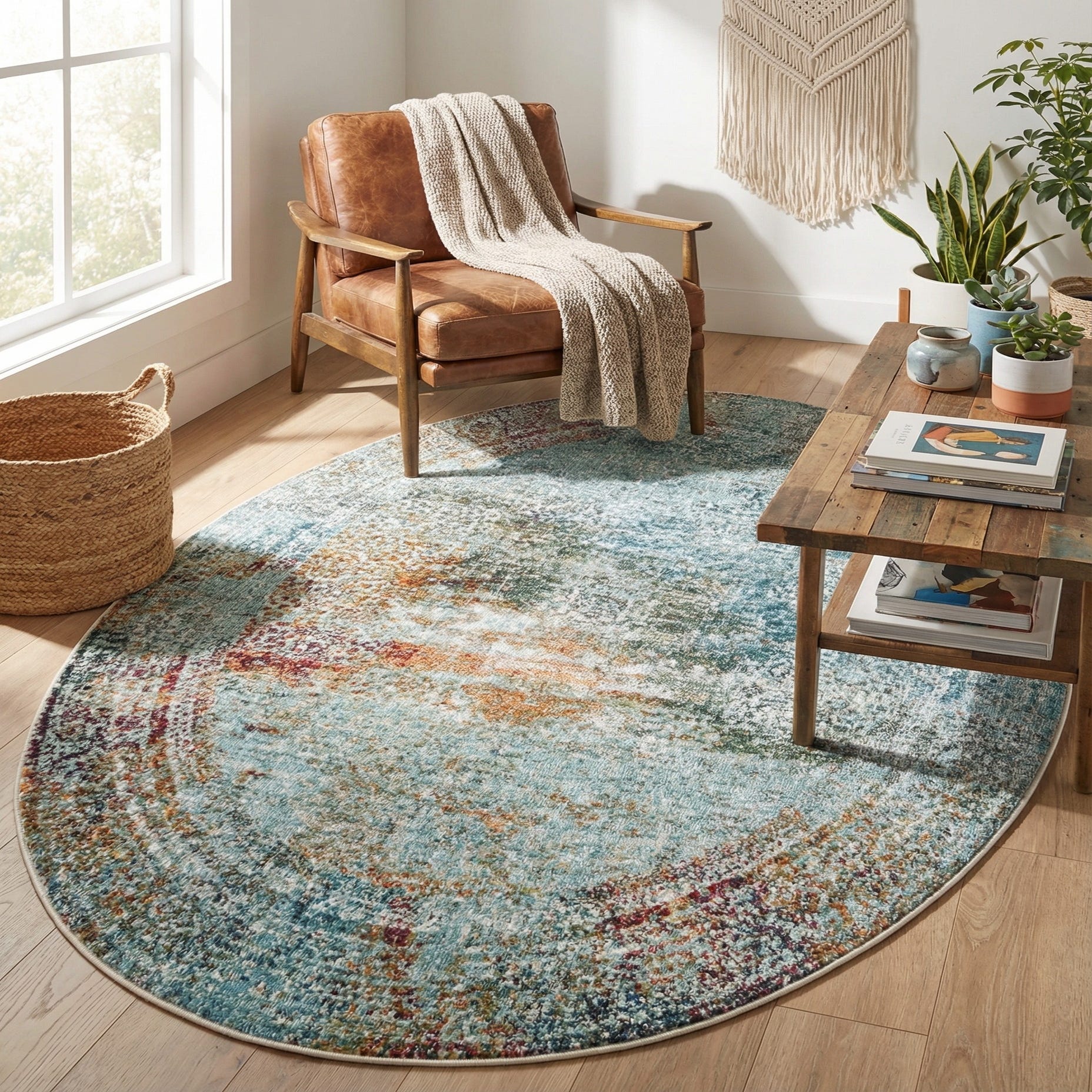 This piece fits a range of interiors—from transitional and modern farmhouse to coastal and eclectic schemes. Pair it with warm wood furniture and neutral upholstery to let the color flecks stand out, or layer it with natural textures like rattan and linen for relaxed, lived-in warmth. The oval shape makes it well suited for an entryway, beneath a round dining table, next to a bed, or as an anchor for a compact seating group.