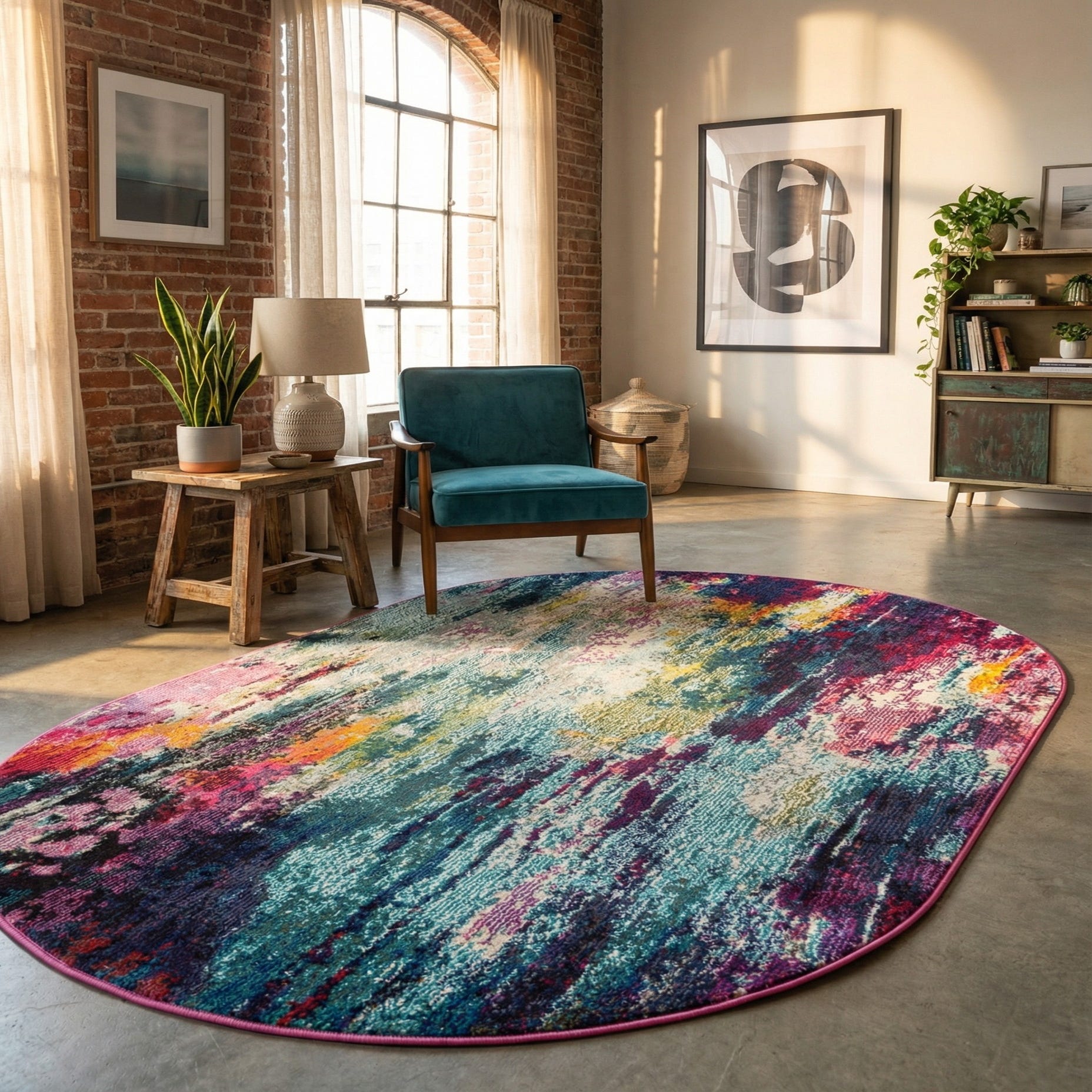 Ideal for adding a splash of color and visual interest to any space, this piece would be at home in contemporary settings, artistic or eclectic environments, or as a statement piece in a more neutral or minimalist room. Its vivid hues and expressive pattern make it a fitting choice for living rooms, creative workspaces, or any interior looking for a modern and bold accent.