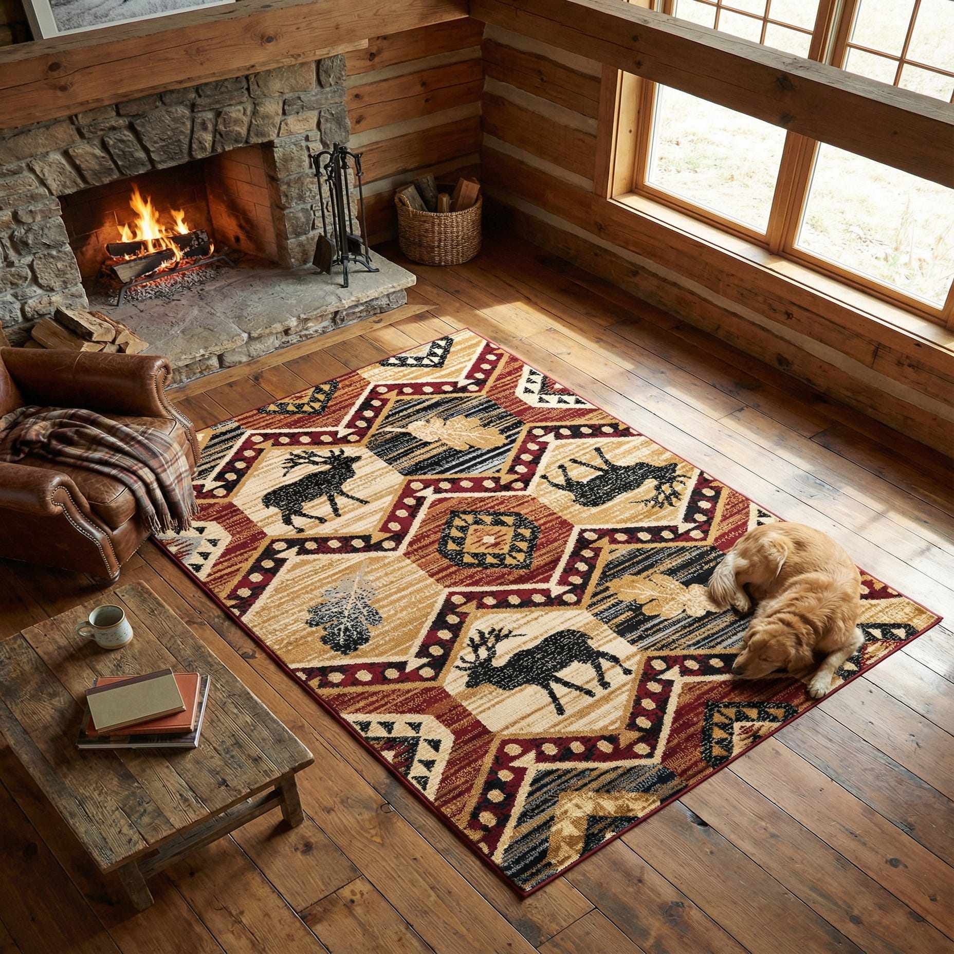 Warm, patterned hexagons and bold motifs give this rug a rustic, lodge-inspired look. Alternating medallions showcase silhouetted deer, stylized leaves and geometric diamonds set against a striated multi background in beige, ivory, red, brown, black and gray. Zigzag bands punctuated with dot accents add movement and a handcrafted aesthetic, while the layered colorwork brings depth to the overall pattern.