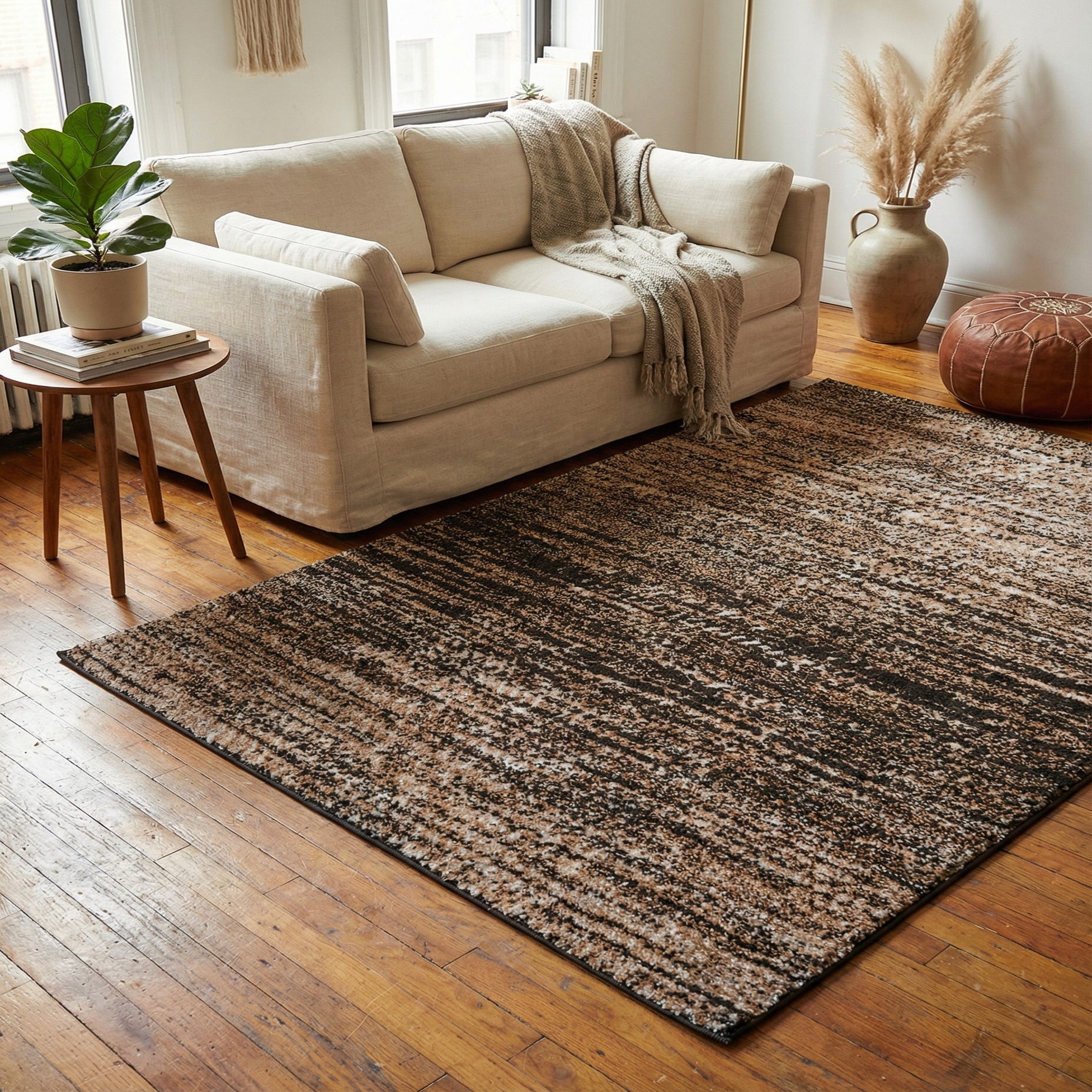 A layered, abstract strié pattern gives this rug a lived-in, textural look; bands of beige, black, ivory and gray intermingle over a multi background to create soft horizontal motion across the surface. The machine-made construction in polypropylene and polyester produces a dense, slightly plush pile that feels soft underfoot while showing subtle highs and lows where the colors blend. Running your hand across it reveals a velvety, tactile finish with a low-sheen that keeps the neutral palette warm and approachable.
