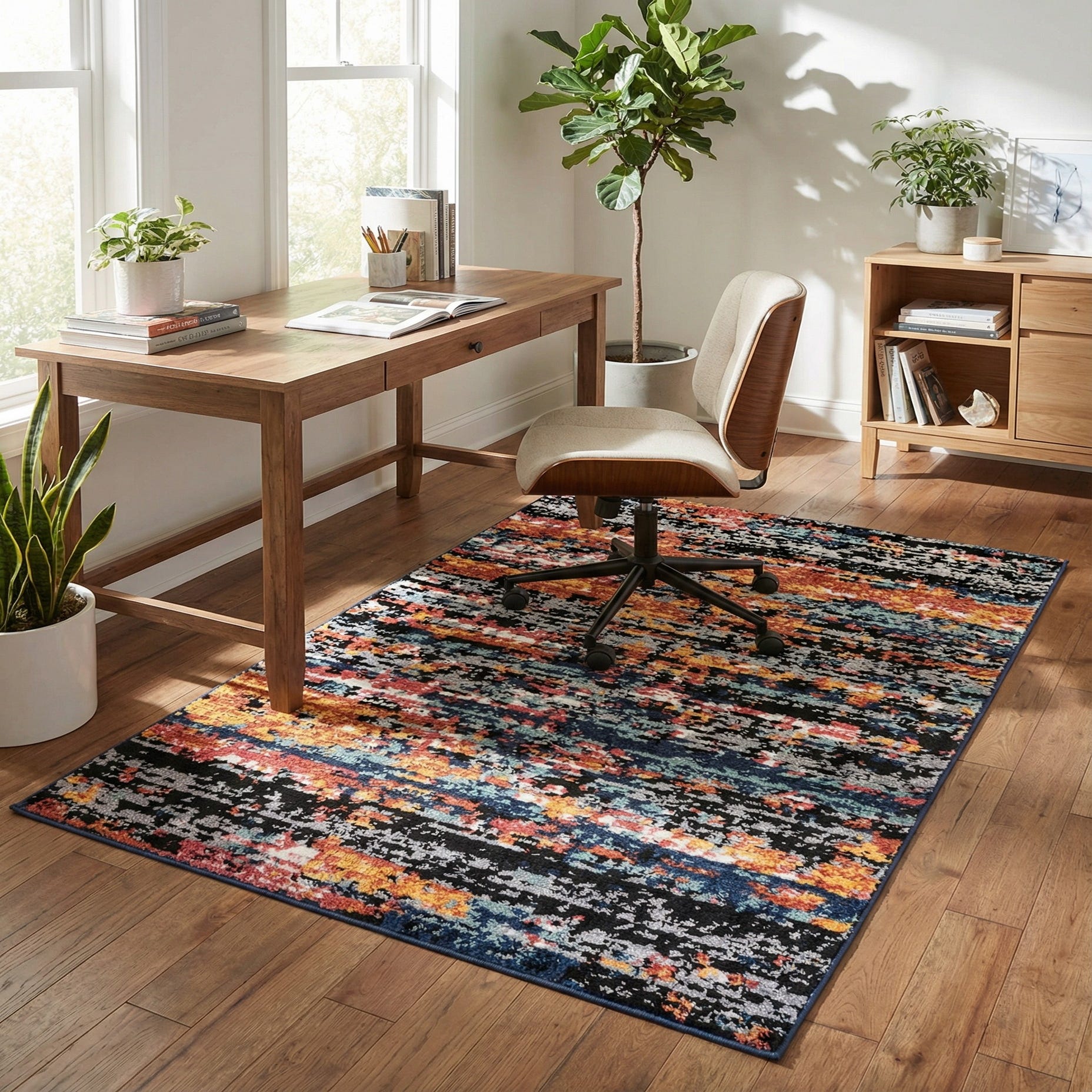 Primary color is Multi. Colors in this rug include: Multi, Black, Ivory, Gray, Navy Blue, Peach, Orange.