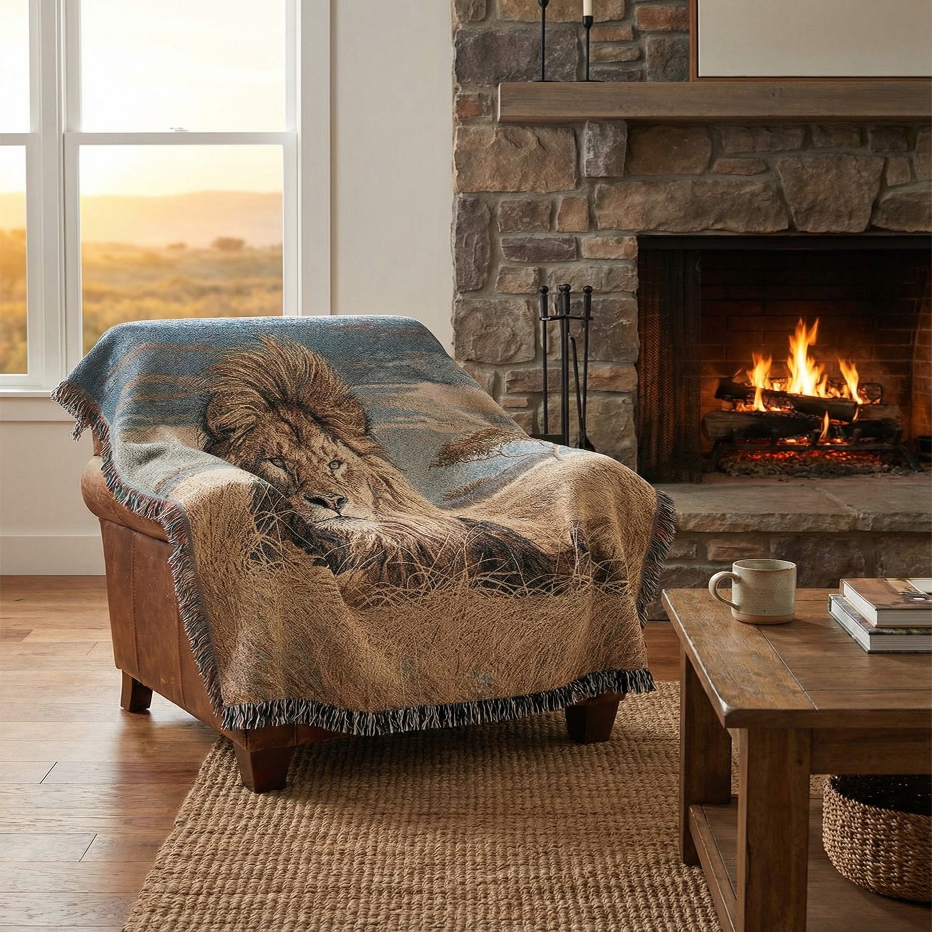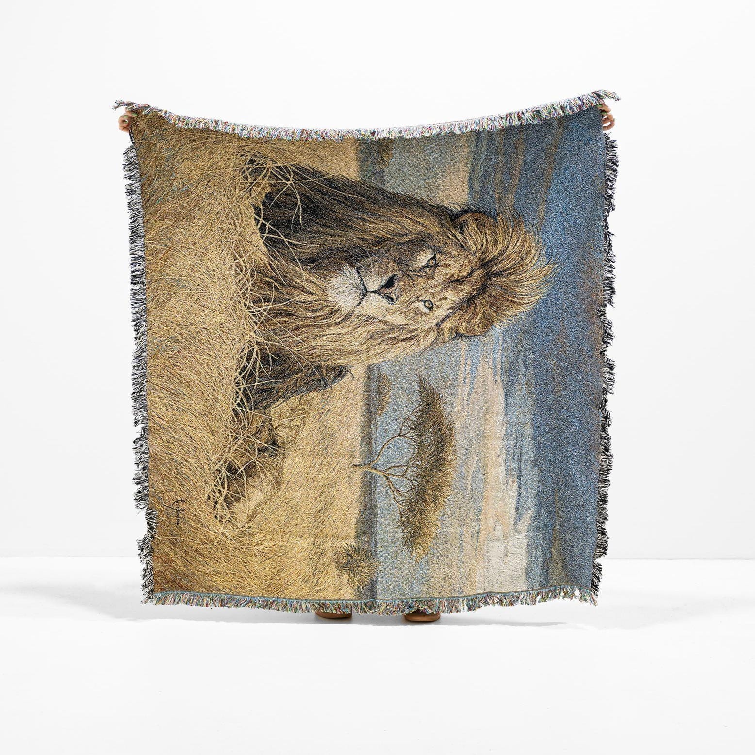 A rectangular 4x6 multi-colored cotton rug featuring a majestic lion in a savanna landscape under a cloudy sky, with fringed edges.