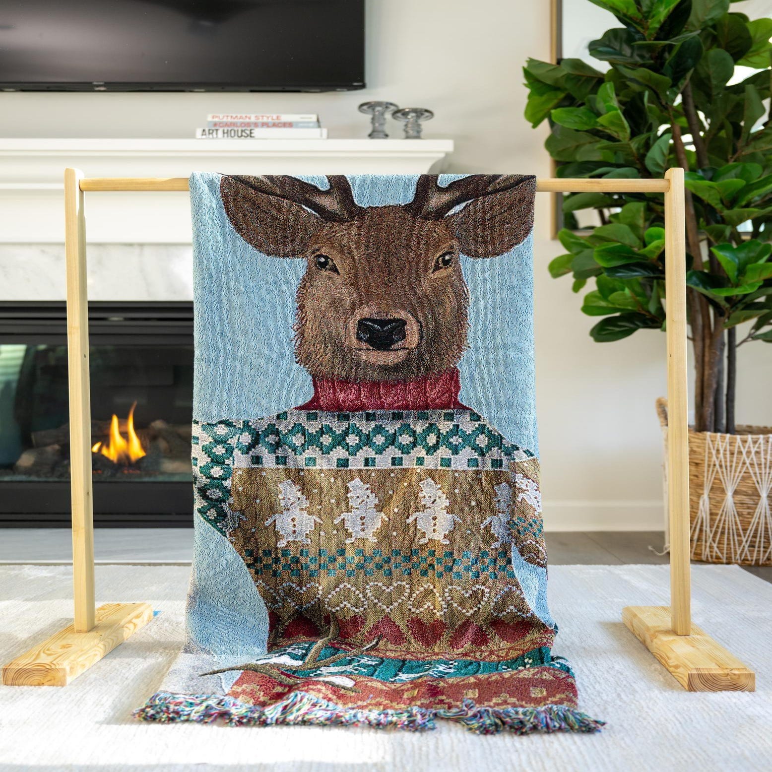 A rectangular 4x6 multi-colored throw blanket featuring a deer in an ugly Christmas sweater with a snowman, set against a light blue background.