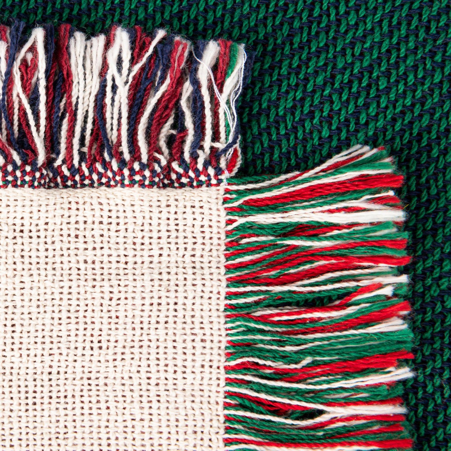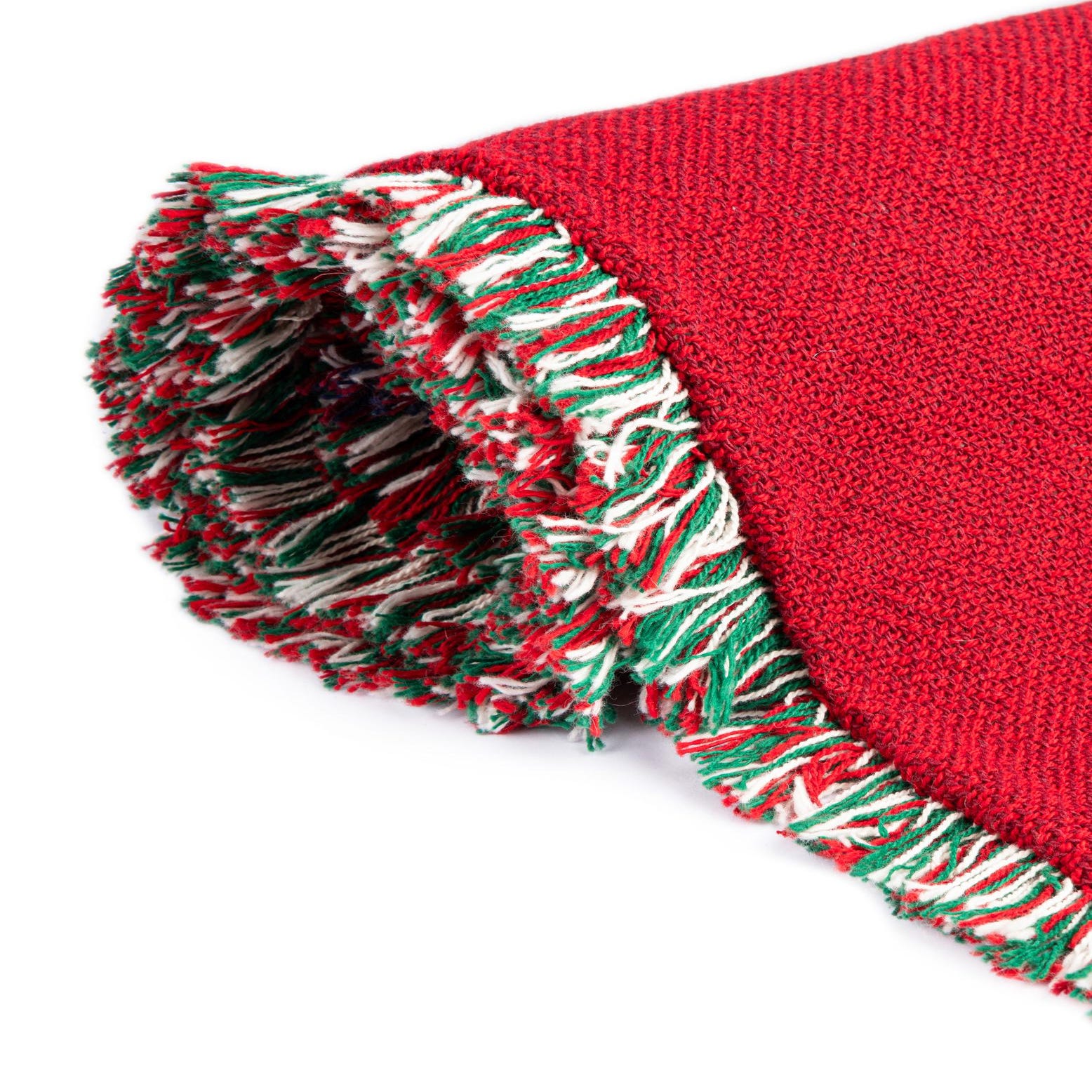 A 4x6 rectangular throw blanket featuring horizontal stripes in dark green, cream, and deep red, with fringed edges.