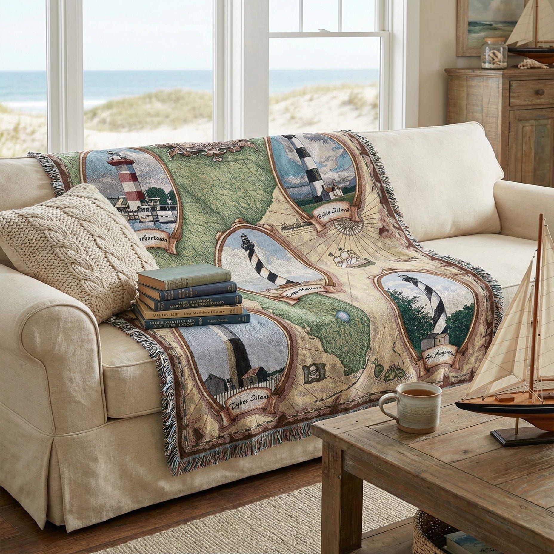 A multi-colored 4x6 rectangular throw blanket featuring a map of the Southeast with five lighthouses in oval frames.