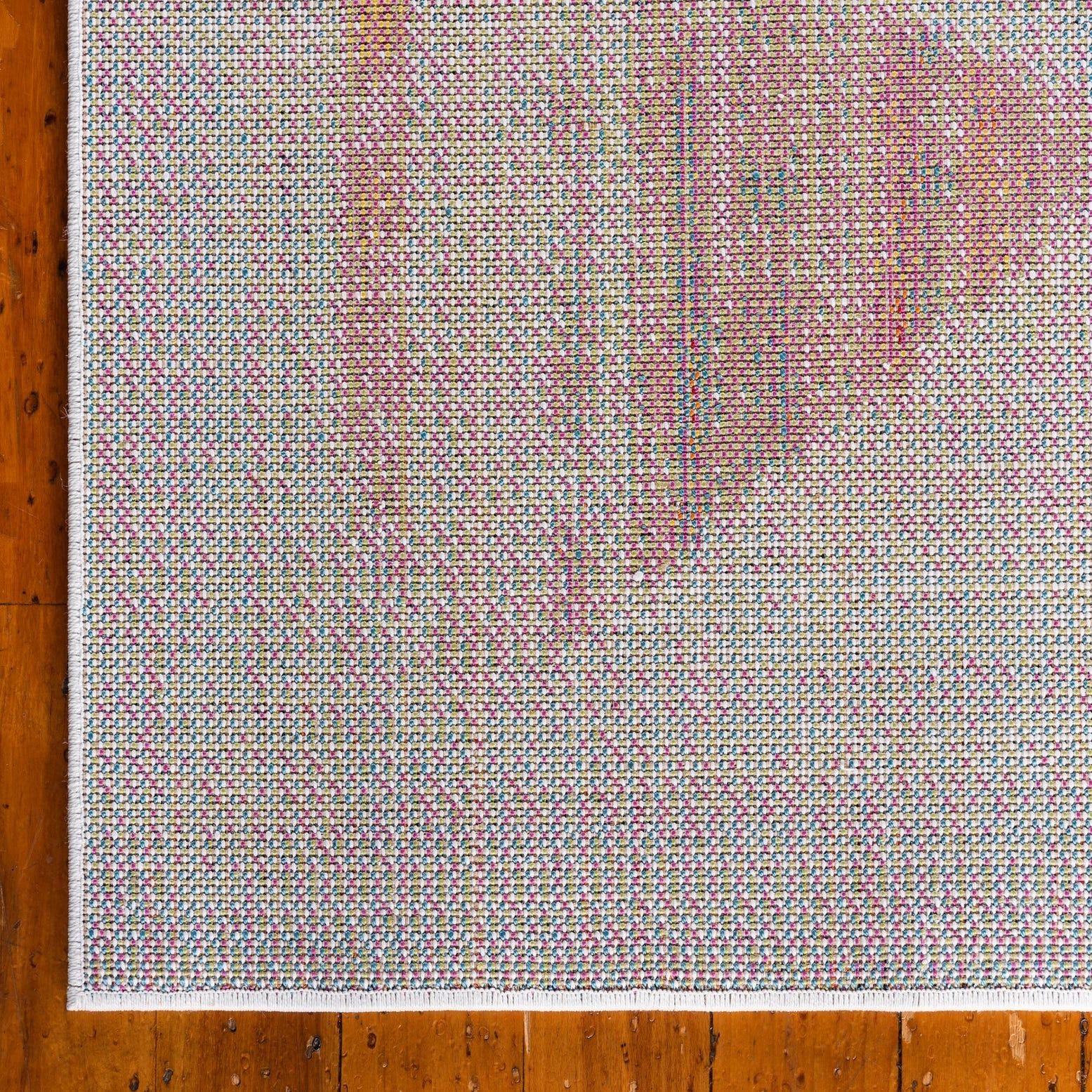 The rug's texture adds a subtle tactile quality to its visual appeal. With a low pile, it is suitable for high-traffic areas and under low-clearance doors. Due to its colorful nature, this piece is versatile, capable of anchoring eclectic interiors or adding a splash of color to minimalist or neutral environments. This area rug would serve well in a modern living room, a playful family room, an artist's studio, or an energetic office space, complementing a variety of decor elements with its rich color palette.