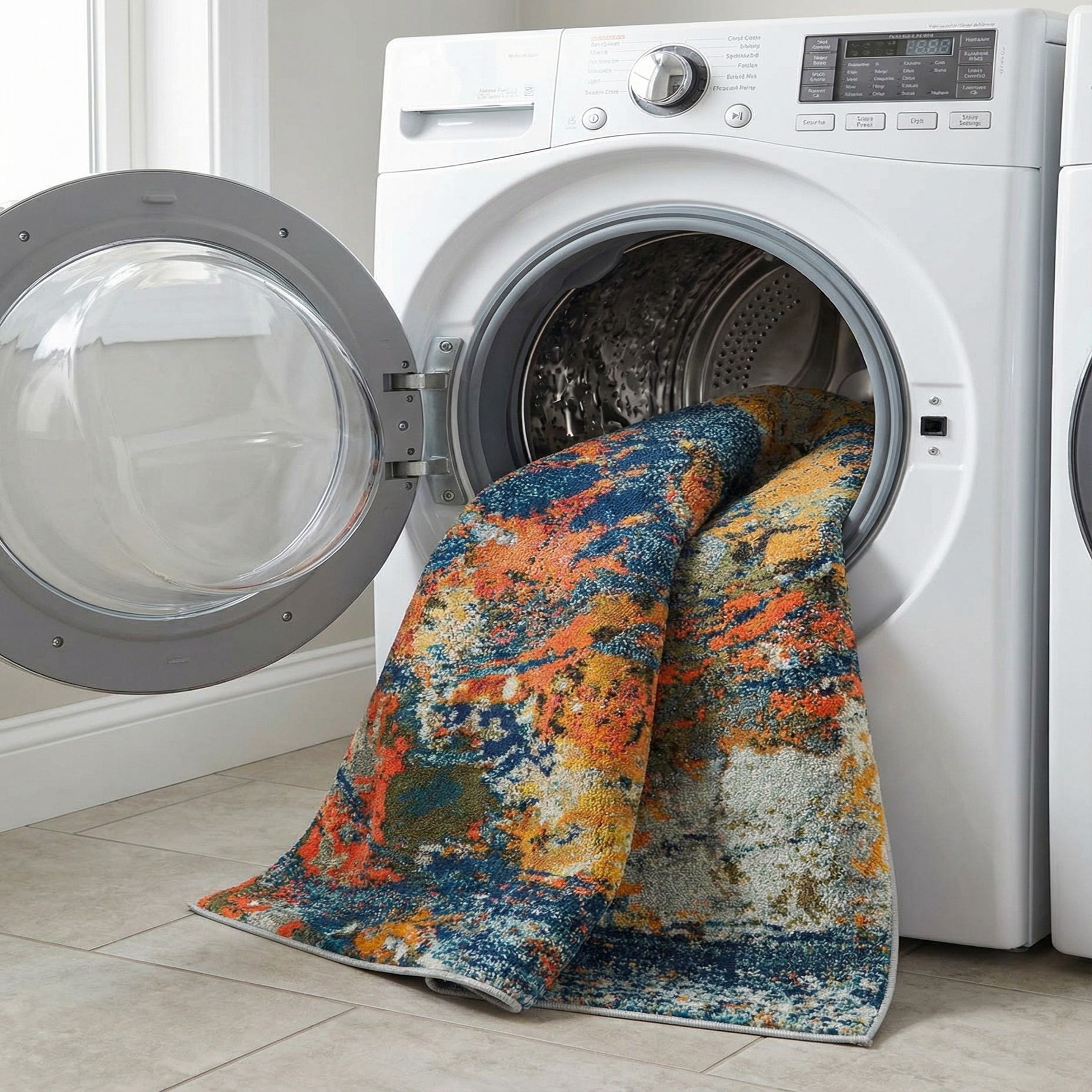 This piece works well as a color anchor in a modern living room or under a coffee table to bring warmth and movement to a neutral seating group. It also complements eclectic or coastal-inspired spaces — pair it with mid-century wood furniture, linen upholstery, or matte black metal accents to let the blues and oranges play off one another. Place it in a home office or bedroom to introduce pattern without overwhelming a room, or layer it over a larger neutral rug for added depth and interest.