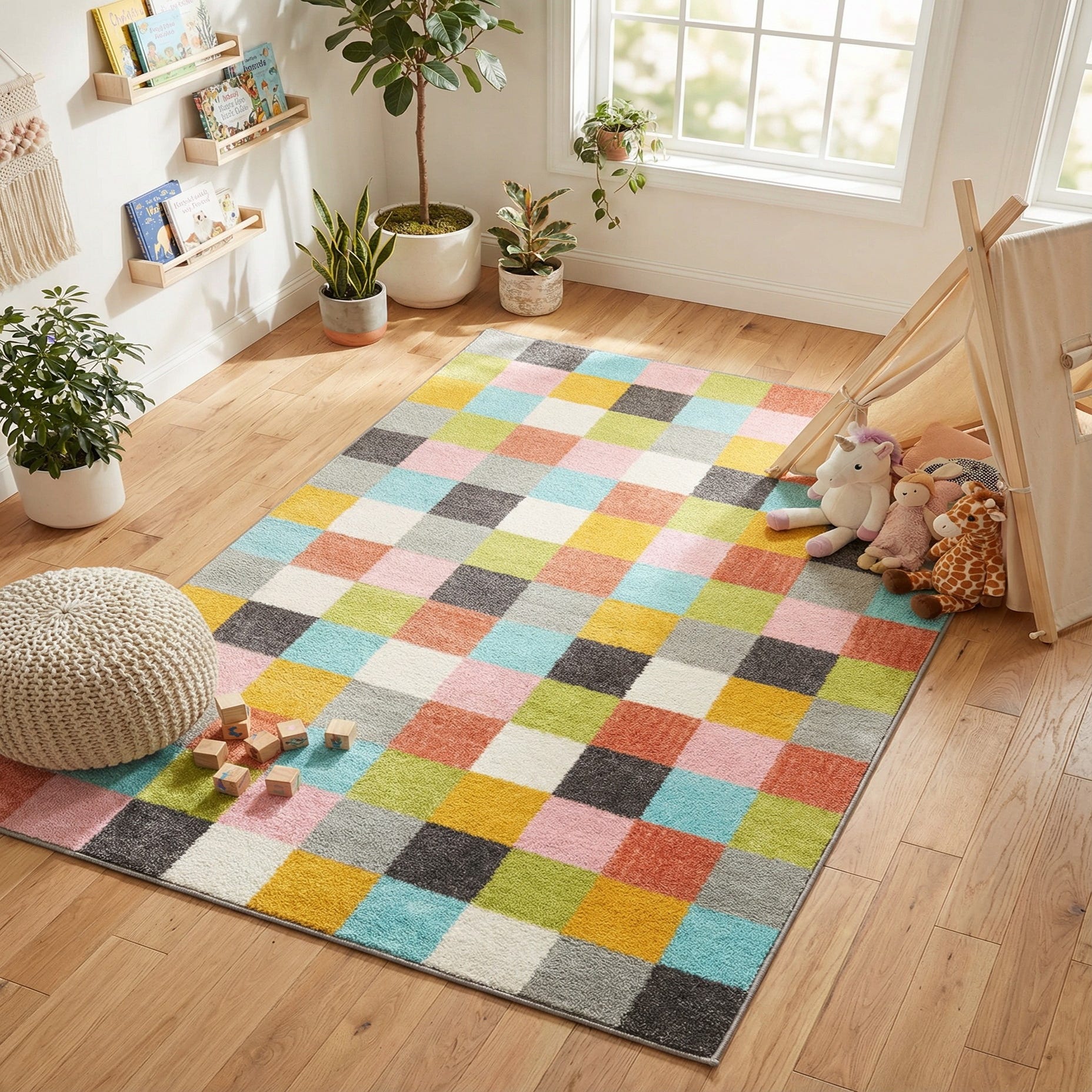A playful checkerboard of colorful squares gives this rug a lively, modern look. Soft shades of blue, pink, yellow, green and ivory sit alongside gray and black accents on a multi-colored field, creating a balanced, cheerful palette. The surface has a soft, cushiony polypropylene pile that feels comfortable underfoot while maintaining a tidy, low-to-medium profile—pleasant to touch and easy to layer with other textures.