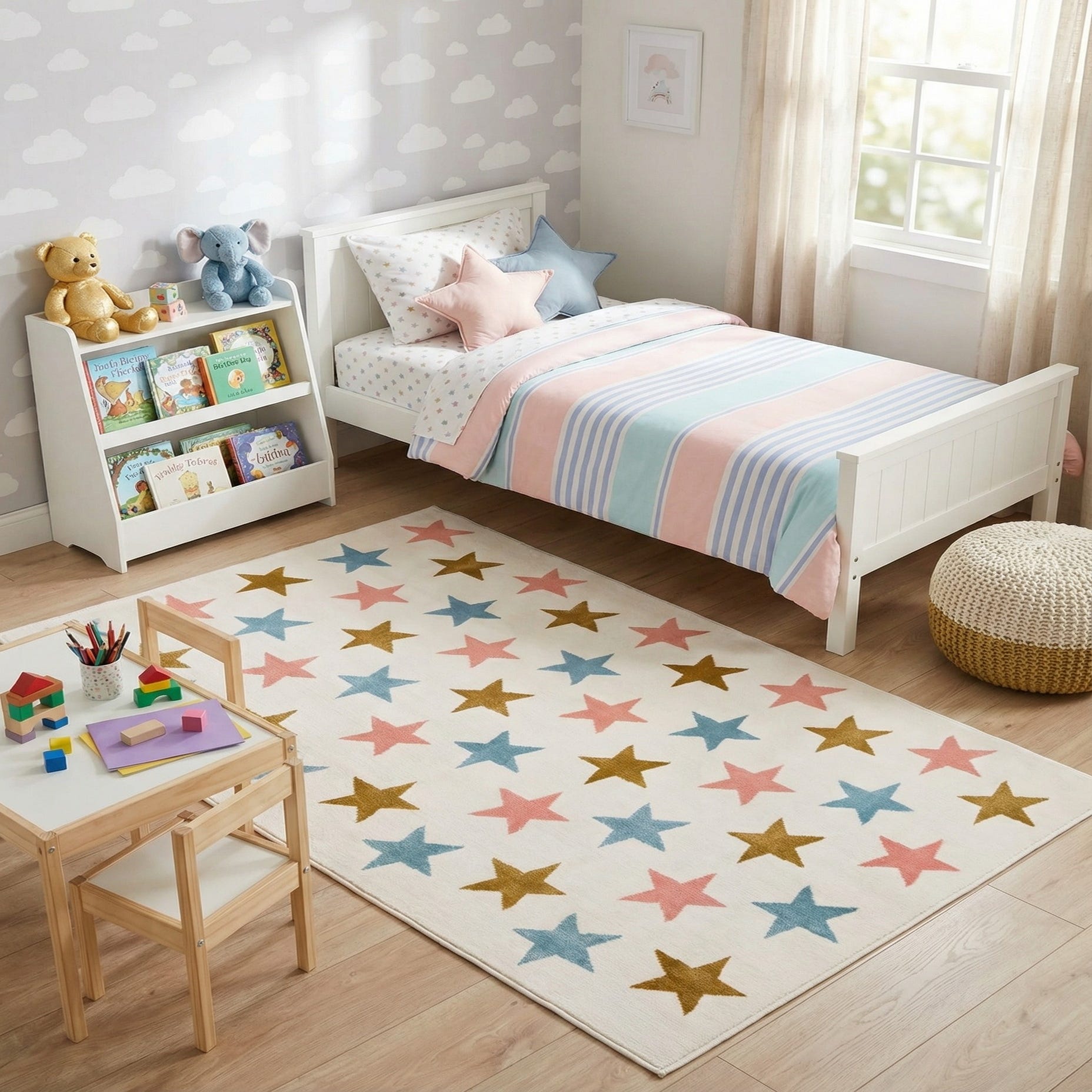 A 4x6 rectangular rug with a white background featuring a playful pattern of pink, blue, and gold stars, perfect for a child's room.