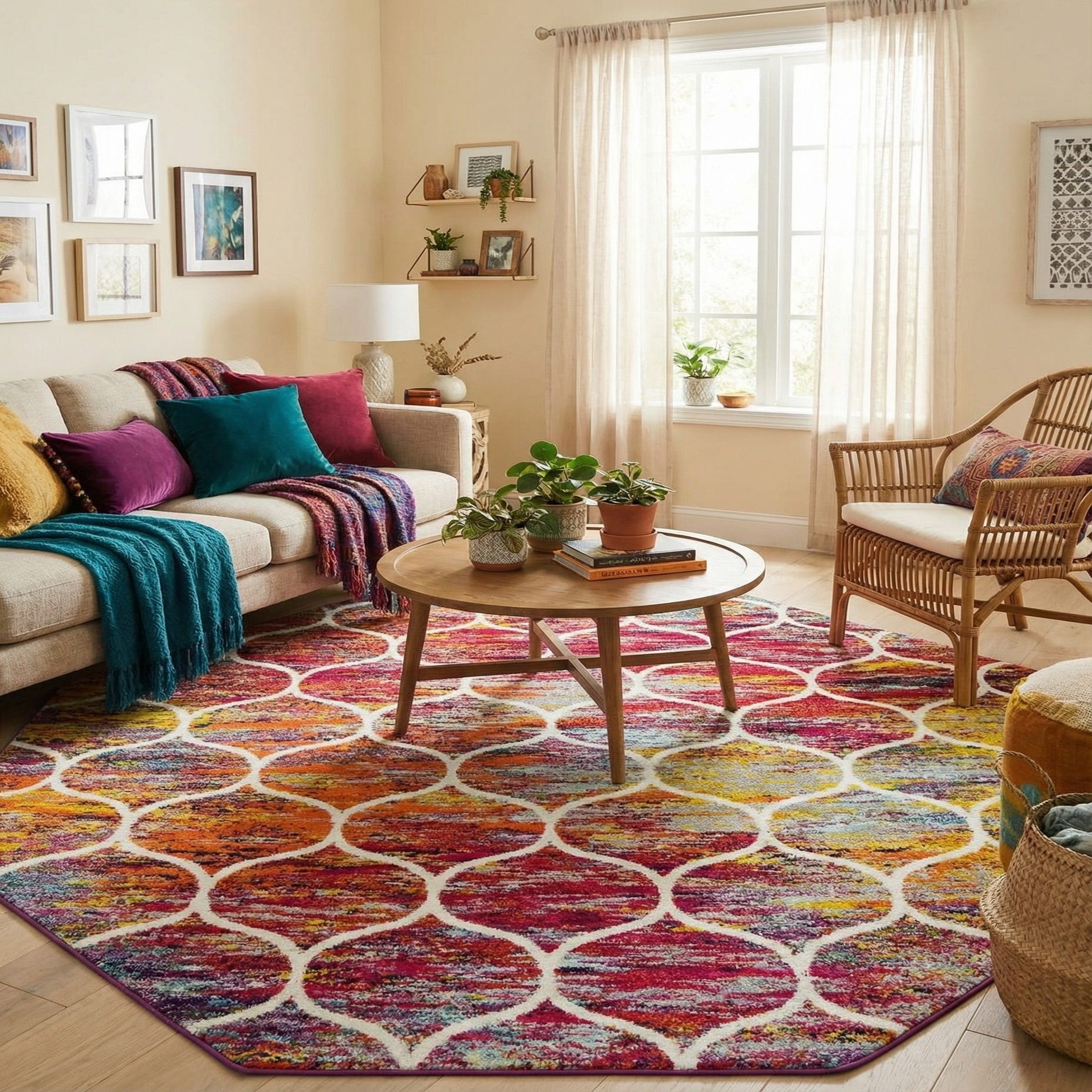 Place this octagon rug to anchor a lively seating area or to add a colorful focal point in an entryway or reading nook. It pairs well with neutral upholstery and warm wood tones to let the palette sing, or layer it with solid, mid-century pieces and brass accents for a modern eclectic look. The shape and scale also complement small round tables or intimate conversation corners, bringing personality and texture to contemporary, bohemian, or transitional interiors.