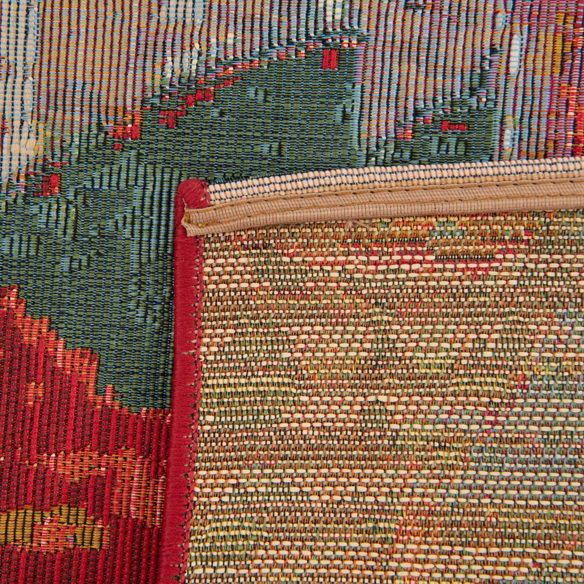 Machine-made from 100% polypropylene, the rug has a low-profile, tightly woven surface with a subtle ribbed feel underfoot. That durable construction works well for covered patios and sunrooms as well as high-traffic indoor spots like an entryway or breakfast nook. Pair it with natural wood or rattan furniture to highlight the warmer tones, or use it with clean-lined metal and neutral upholstery to let the colorful pattern be the focal point.