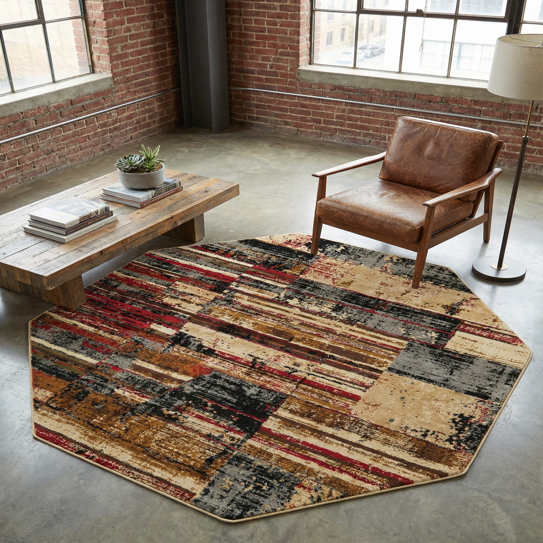 A bold, octagonal area rug with an abstract, patchwork-inspired pattern that balances rectilinear blocks and horizontal striations. The multi background carries warm beige, brown and gold fields broken by charcoal black and steel gray accents, with touches of red that punctuate the composition. Machine-made from 100% polypropylene, the rug has a low, dense pile with a smooth, slightly cushioned hand and a subtle luster that brings depth to the distressed textures and layered colorwork.