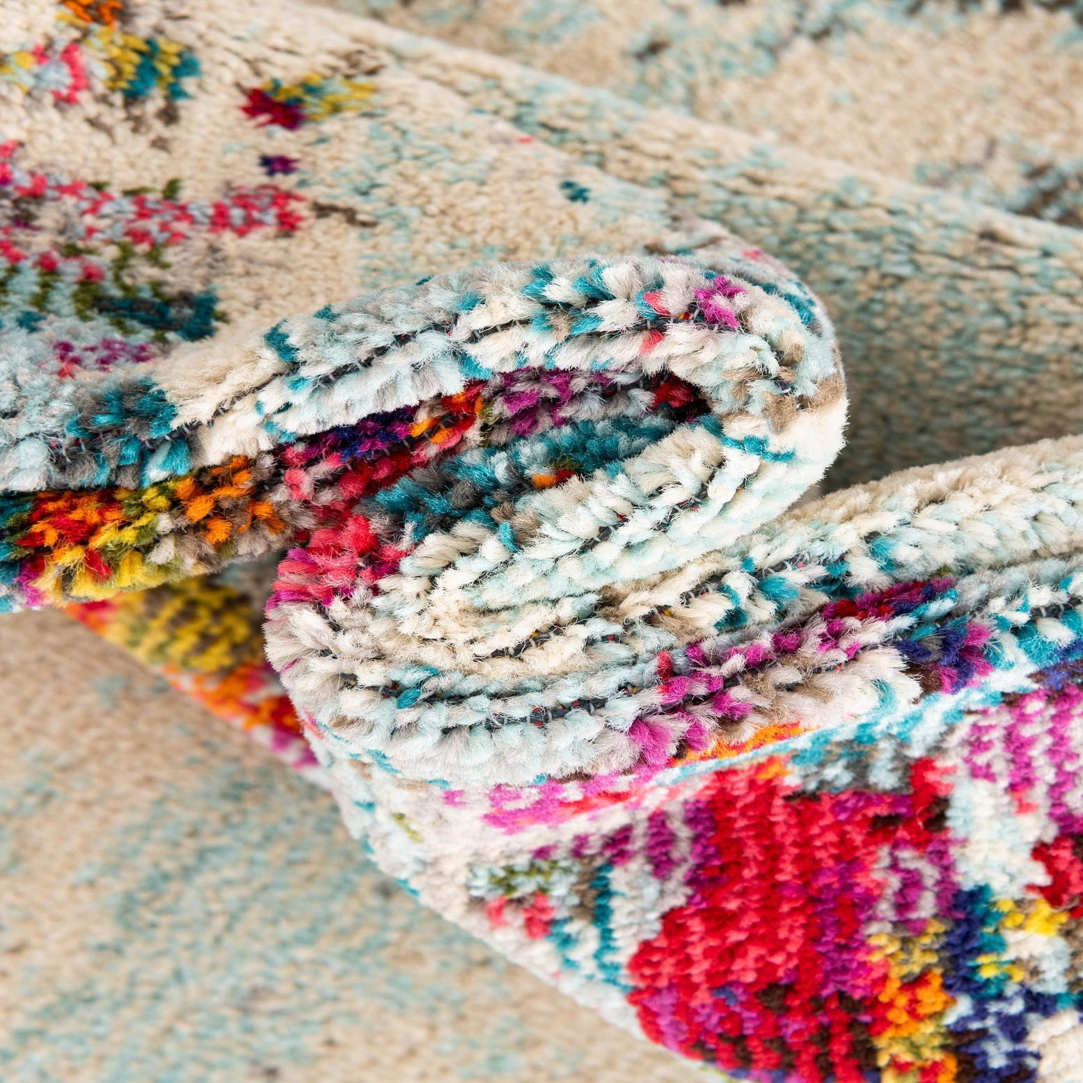 The shape and palette make this piece versatile—place it beneath a round dining table or in a small seating nook to define the area without overwhelming the room. It pairs cleanly with neutral linen sofas and warm wood tones, and also complements mid-century modern furnishings or eclectic interiors that layer patterns and color. Use it to add a measured pop of color to a minimalist living room, or as a lively anchor in a casual, art-filled space.