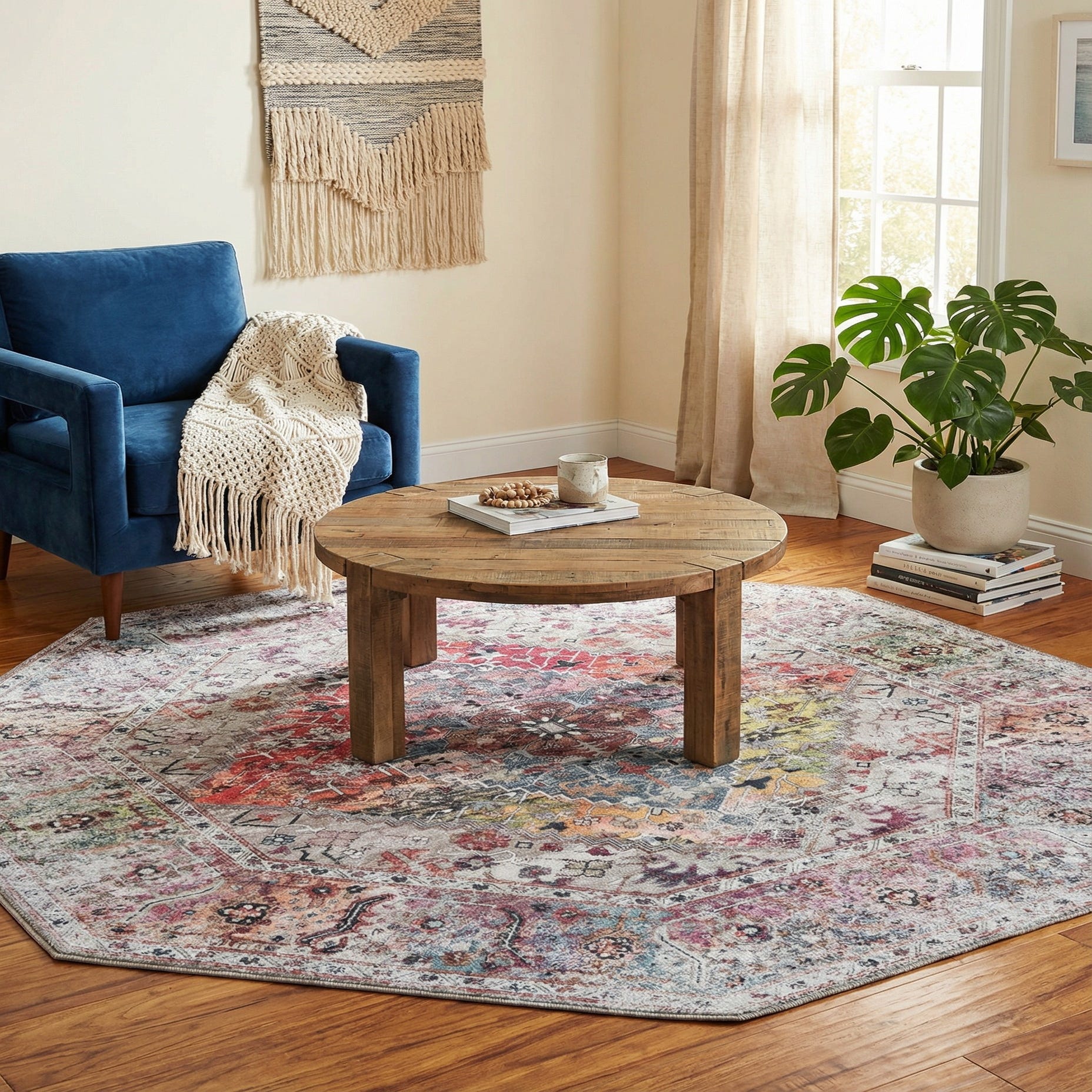 An octagonal area rug with a vintage-inspired medallion layout, this piece layers geometric and floral motifs across a distressed, multi-colored ground. A rust red and navy central medallion anchors the composition while soft fields of ivory and gray provide contrast. Accents of light blue, deeper blue, yellow and touches of red are woven throughout the border and inner patterns, giving the rug a lively, lived-in look without overpowering a room.