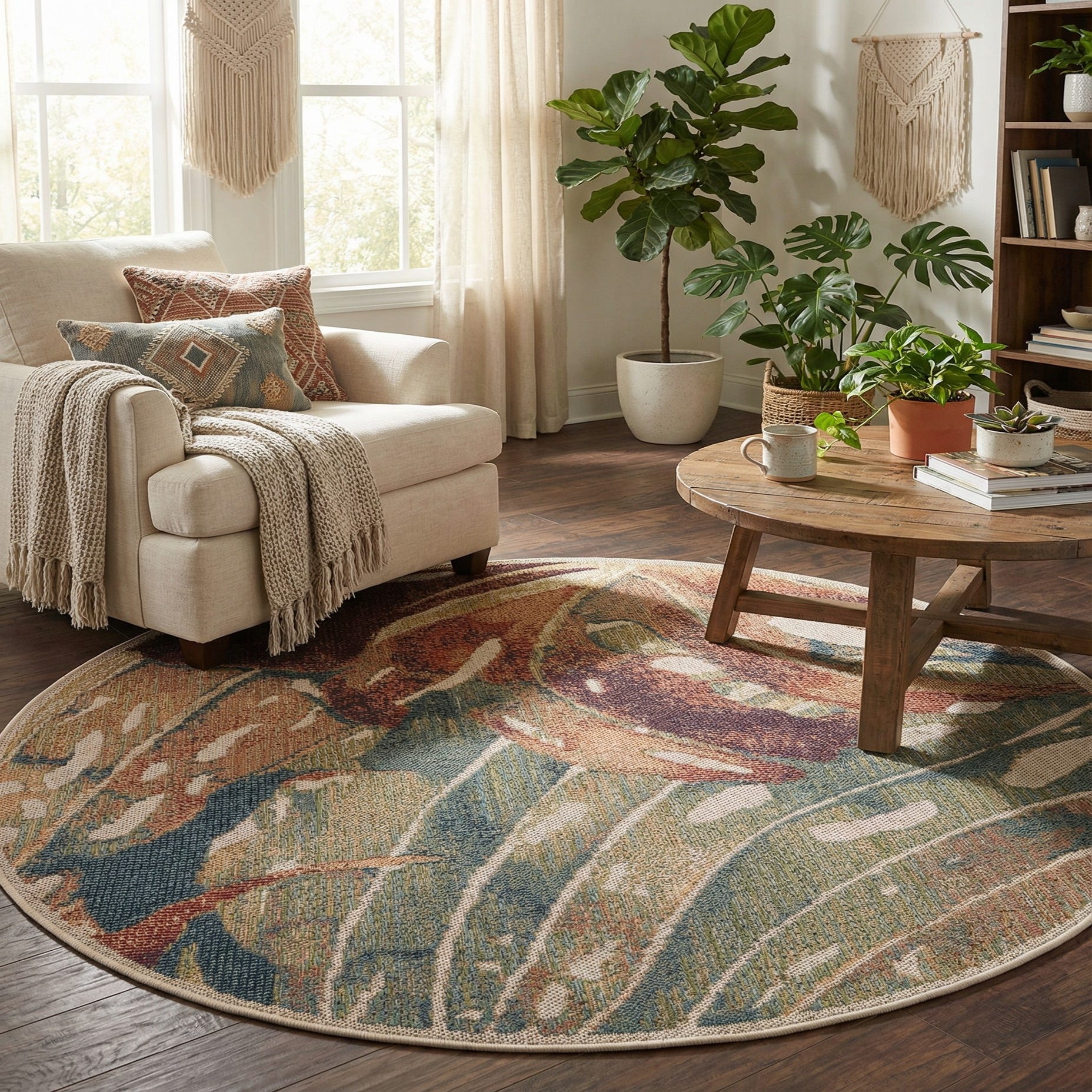 Well-suited to outdoor and casual indoor settings, this round piece works nicely beneath a bistro set on a covered patio, under rattan seating in a sunroom, or centered in a relaxed living area to define a conversation nook. Pair it with natural wood furniture, woven textures, and navy or rust accents for a cohesive look, or use it to introduce layered patterning in boho, coastal, or rustic-modern schemes.