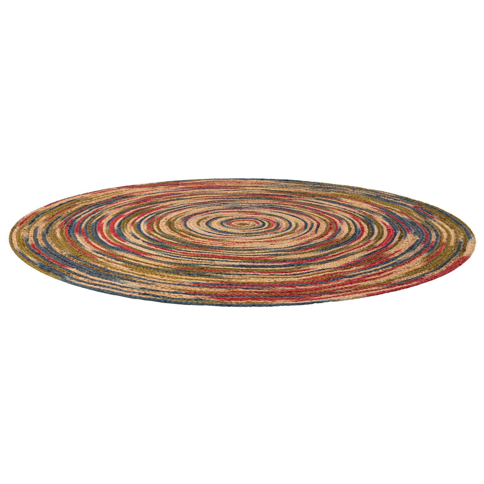 A 5' 1 round multi-colored braided jute rug with concentric circles of natural tan, blue, red, and green.