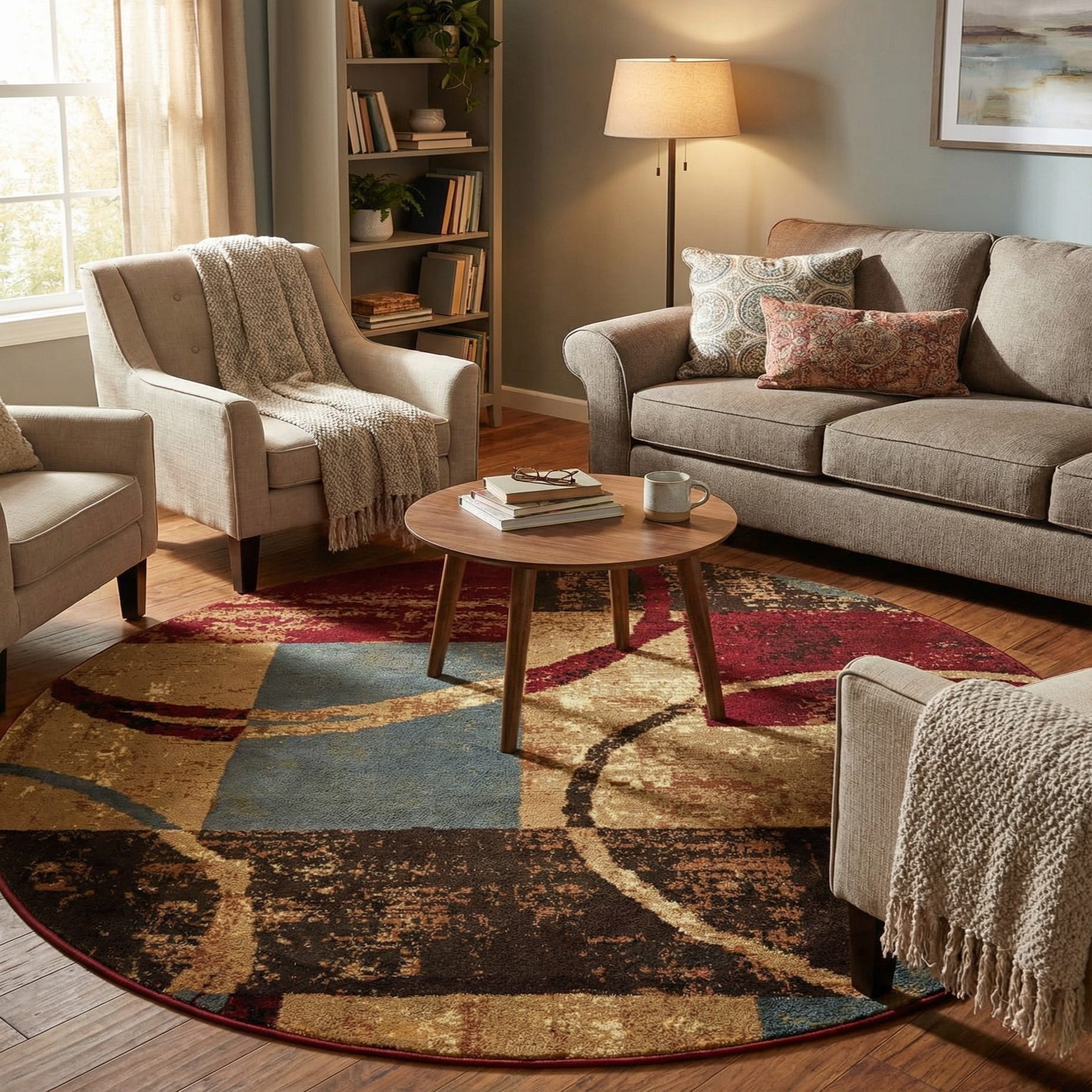 Machine-made from 100% polypropylene, the low-pile surface is smooth and slightly plush to the touch, with enough density to hold its shape beneath furniture. Use it to anchor a round dining table, define a cozy seating area in a den, or add visual interest to an entry or home office. It pairs particularly well with warm wood tones, leather seating, and neutral upholstery, and also complements accent pieces in deep blue or burgundy for a coordinated, layered look.