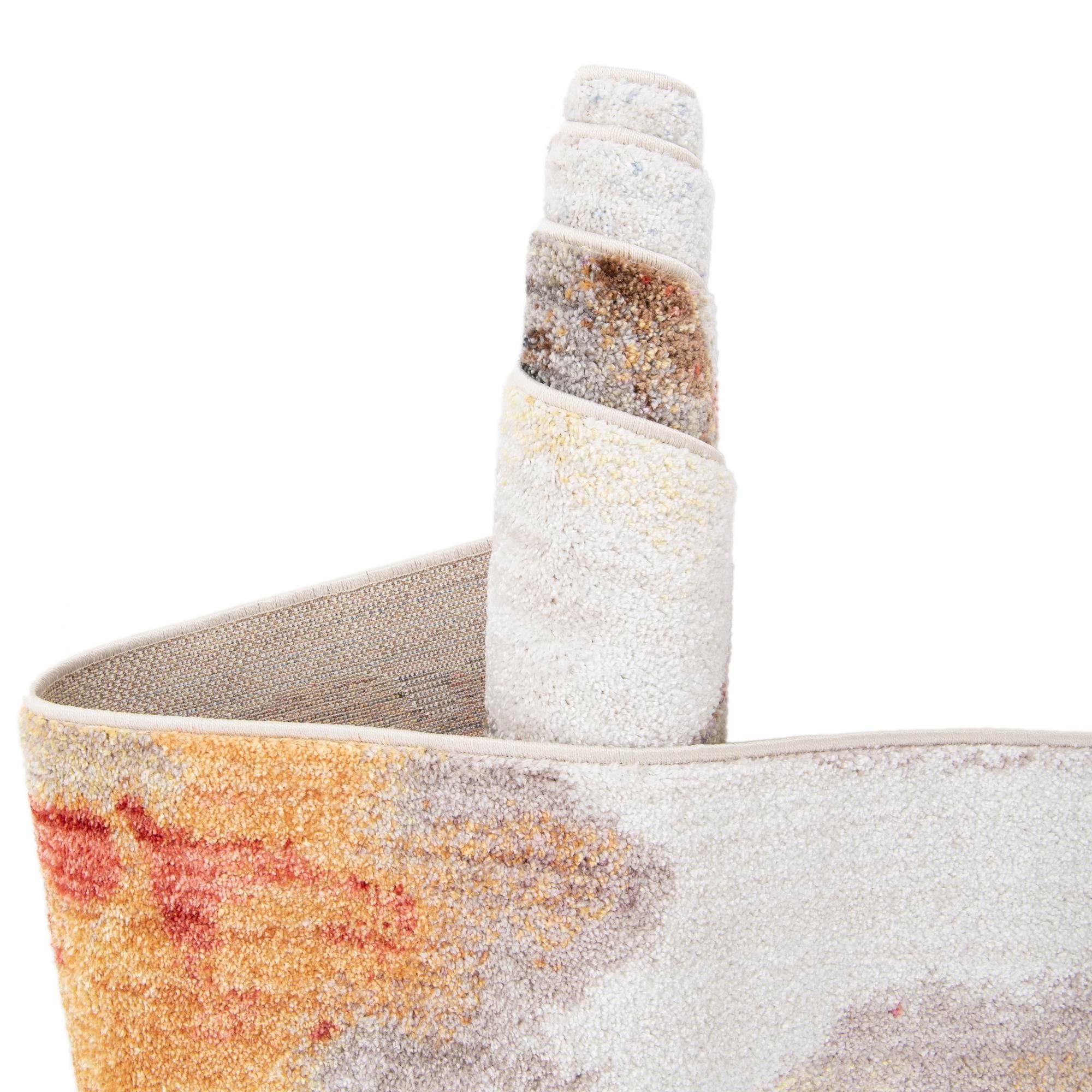 An abstract, painterly composition of cloud-like color fields and layered washes gives this round rug a modern-art feel. Warm tones of orange, rust red and peach blend with cool blues, violet and touches of brown, cream and ivory across a multi background. Machine made of 100% Polyester (Space-Dyed Yarn), the space-dyed fibers create subtle color variation and a gentle, low-profile pile that feels soft underfoot with a slight sheen from the yarn.