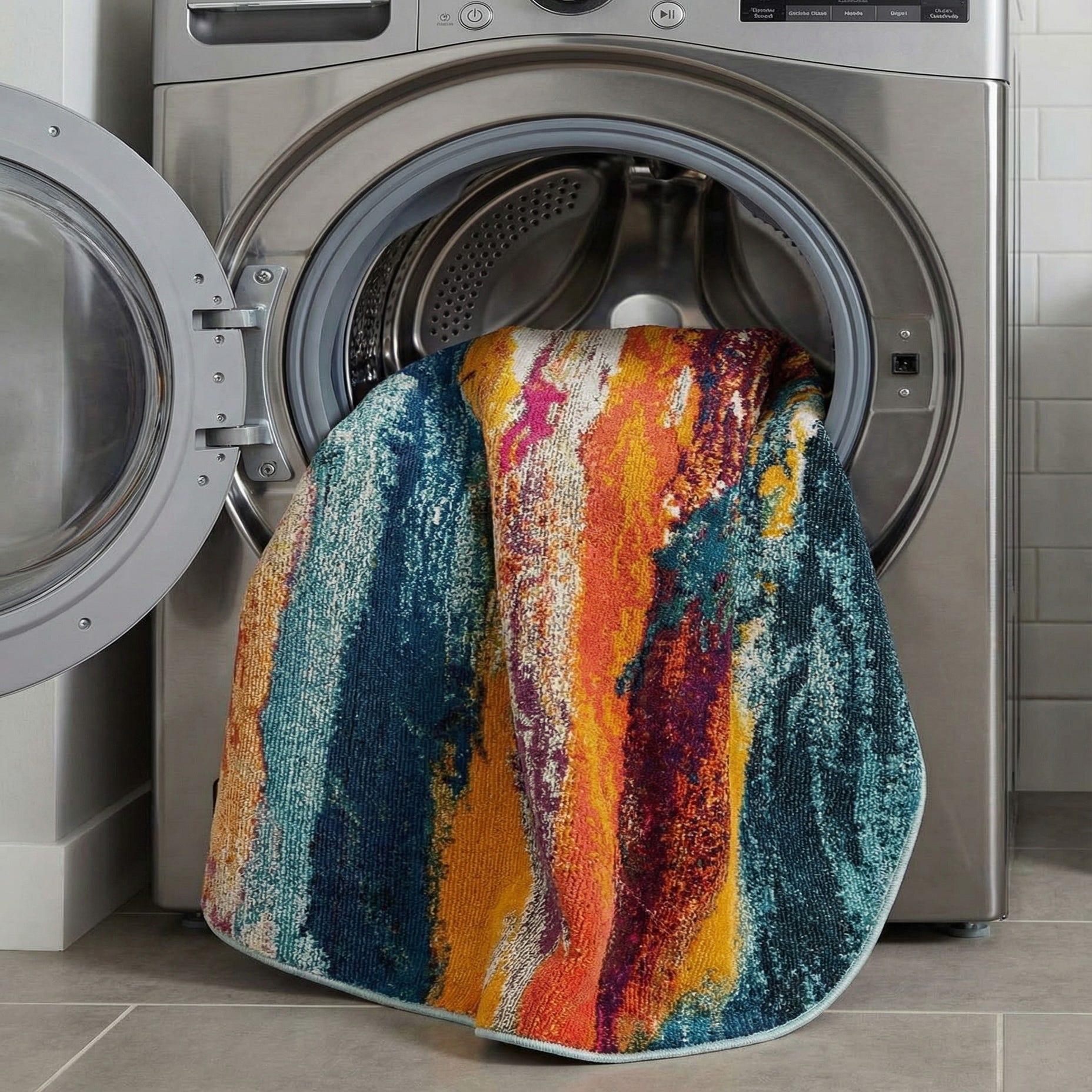A vivid, painterly design of vertical brushstroke bands moves across a multicolored field, bringing energetic color and motion to the floor. Rich navy and deep burgundy blend with teal, light blue, olive, mustard yellow, orange, red, pink, purple and ivory to create layered, saturated stripes that catch the eye from every angle. The machine-made construction produces a smooth, even surface with subtle visual texture where the colors overlap, while the polypropylene fibers feel soft and resilient underfoot.