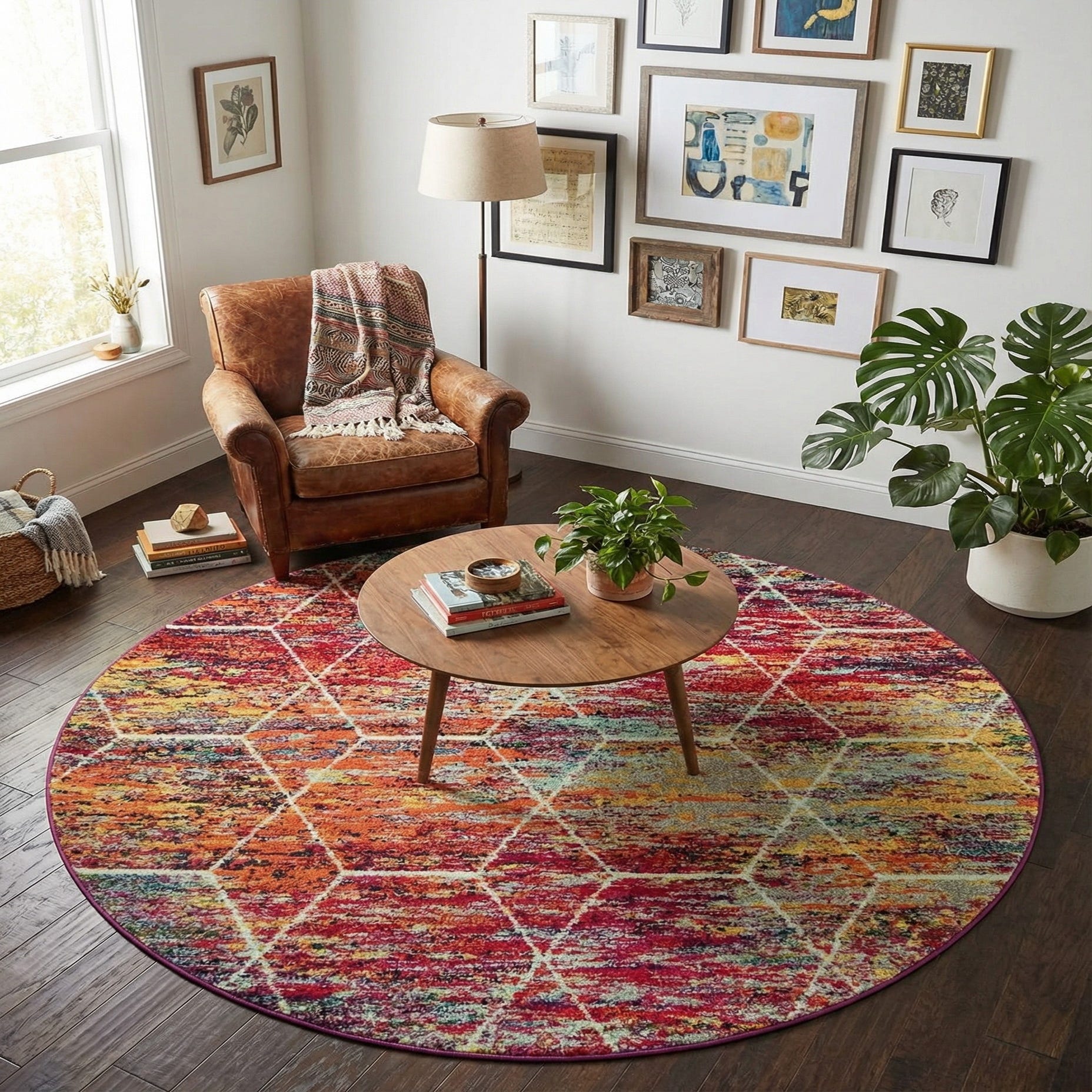 The round shape anchors conversational seating areas, a cozy breakfast nook, or a home office, and pairs especially well with mid-century modern sofas, simple wooden dining sets, or eclectic bohemian furnishings. Use it to introduce color in a neutral room, to echo accent tones in patterned pillows or artwork, or to define a small seating vignette in an open-plan space.
