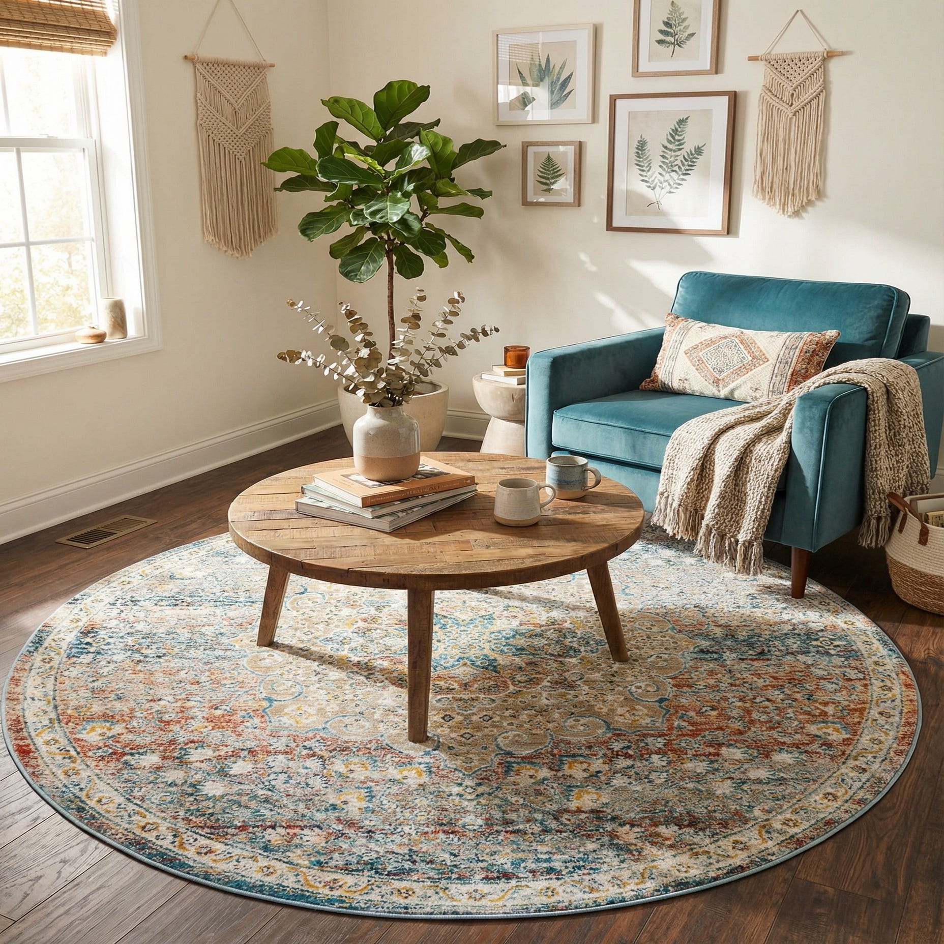 A softly distressed medallion anchors this round rug, where traditional floral and scrolling motifs blend with a painterly, layered background. The multi background carries washes of blue and light blue alongside gray and ivory, while accents of light brown, rust red and terracotta bring warmth and depth. The overall look reads as vintage-inspired yet fresh, with the pattern and color shifts creating a lived-in, layered appearance that works well in both classic and more relaxed interiors.