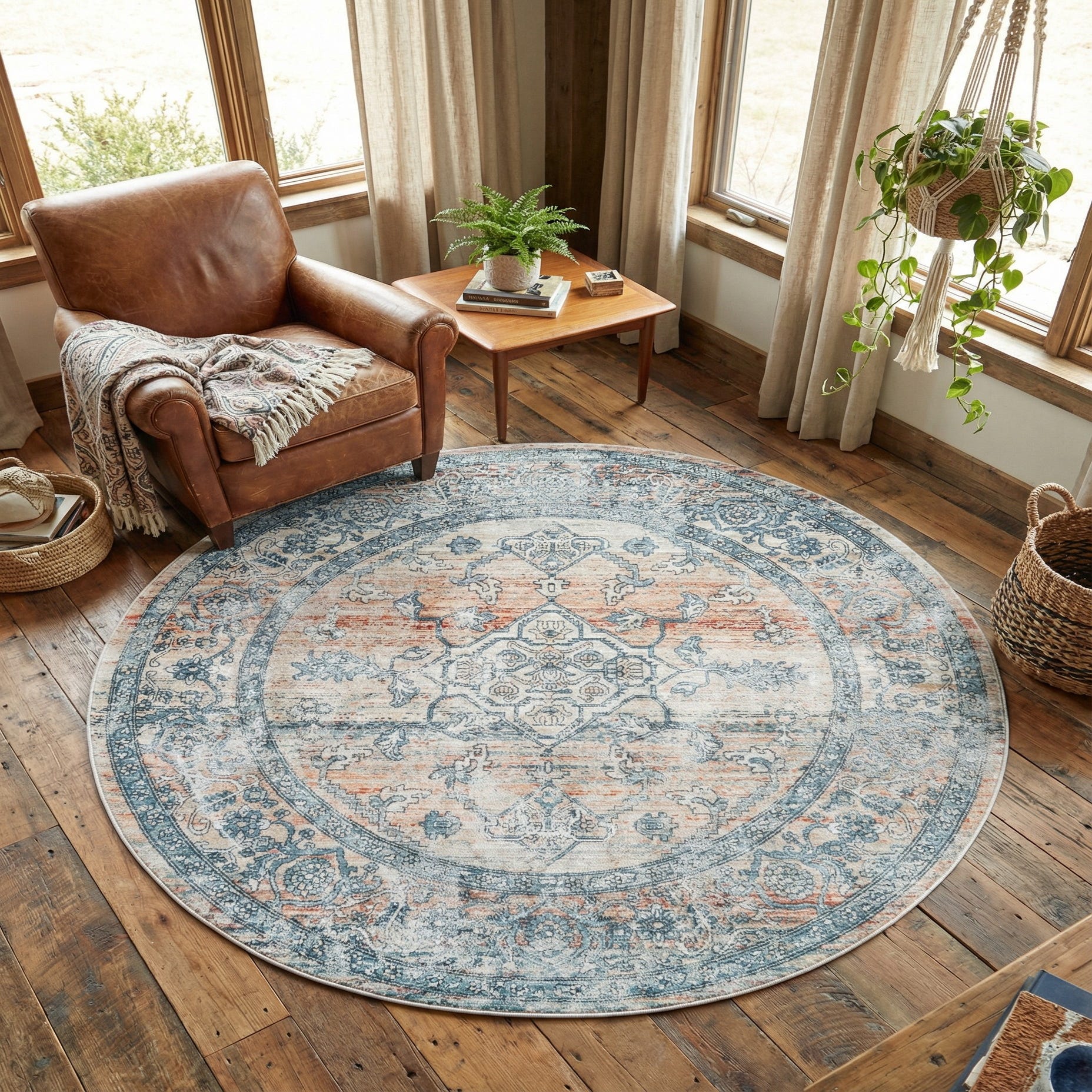 This rug fits well in a variety of interiors—place it under a round dining table to define the eating area, anchor a conversational seating group in a living room, or add color and texture to a bedroom reading nook. It pairs naturally with linen or neutral upholstery, weathered wood finishes, and metal or leather accents; use its blue tones to calm a coastal or transitional palette, or pull the terracotta and rust hues into warmer, rustic-modern schemes.