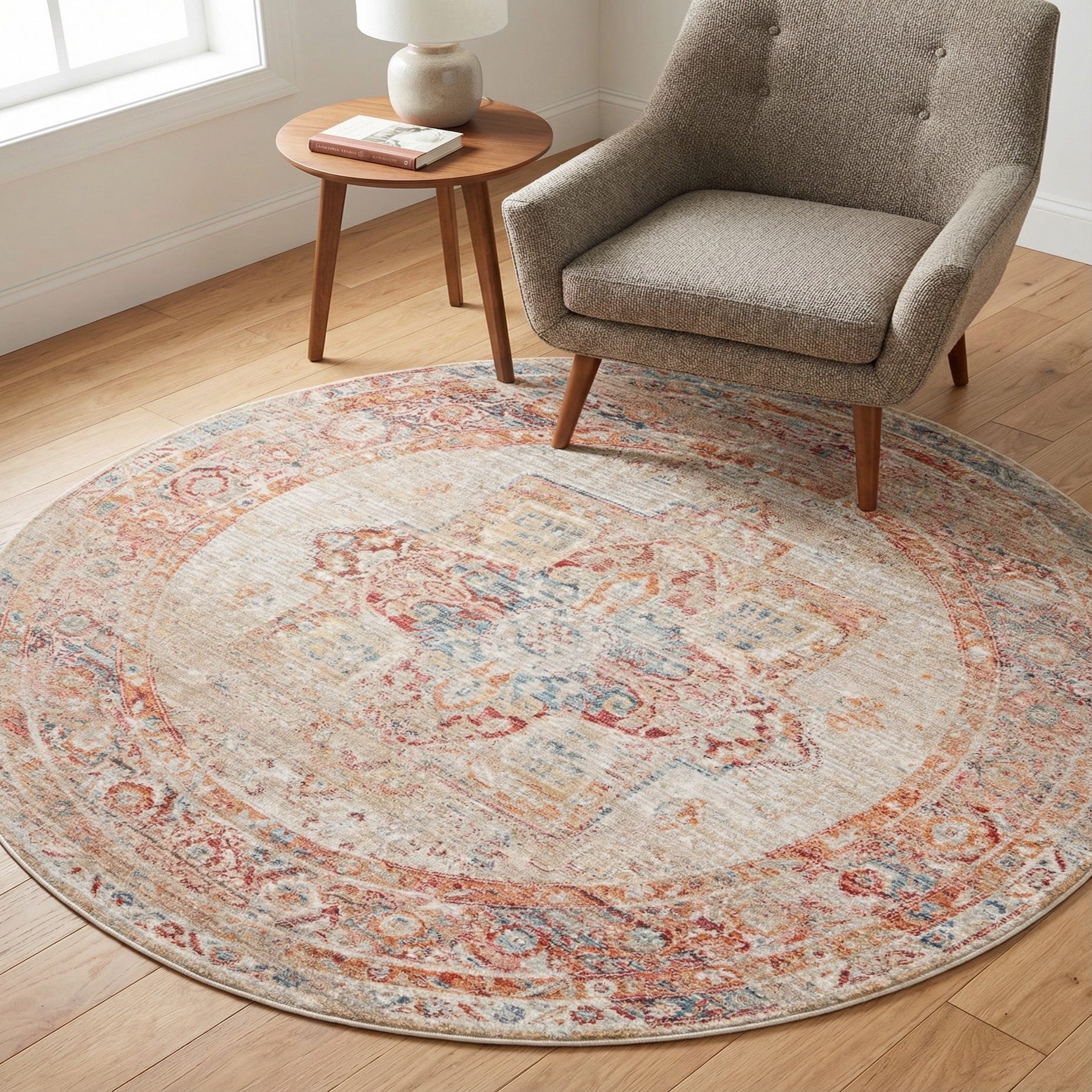 This piece anchors a round dining table or a small seating area, bringing warmth to an entryway or a cozy reading nook. Pair it with light wood furniture and linen upholstery for a casual, transitional look, mix with mid-century pieces and brass accents for a bit of contrast, or layer it beneath traditional furnishings to introduce color without overwhelming the room.