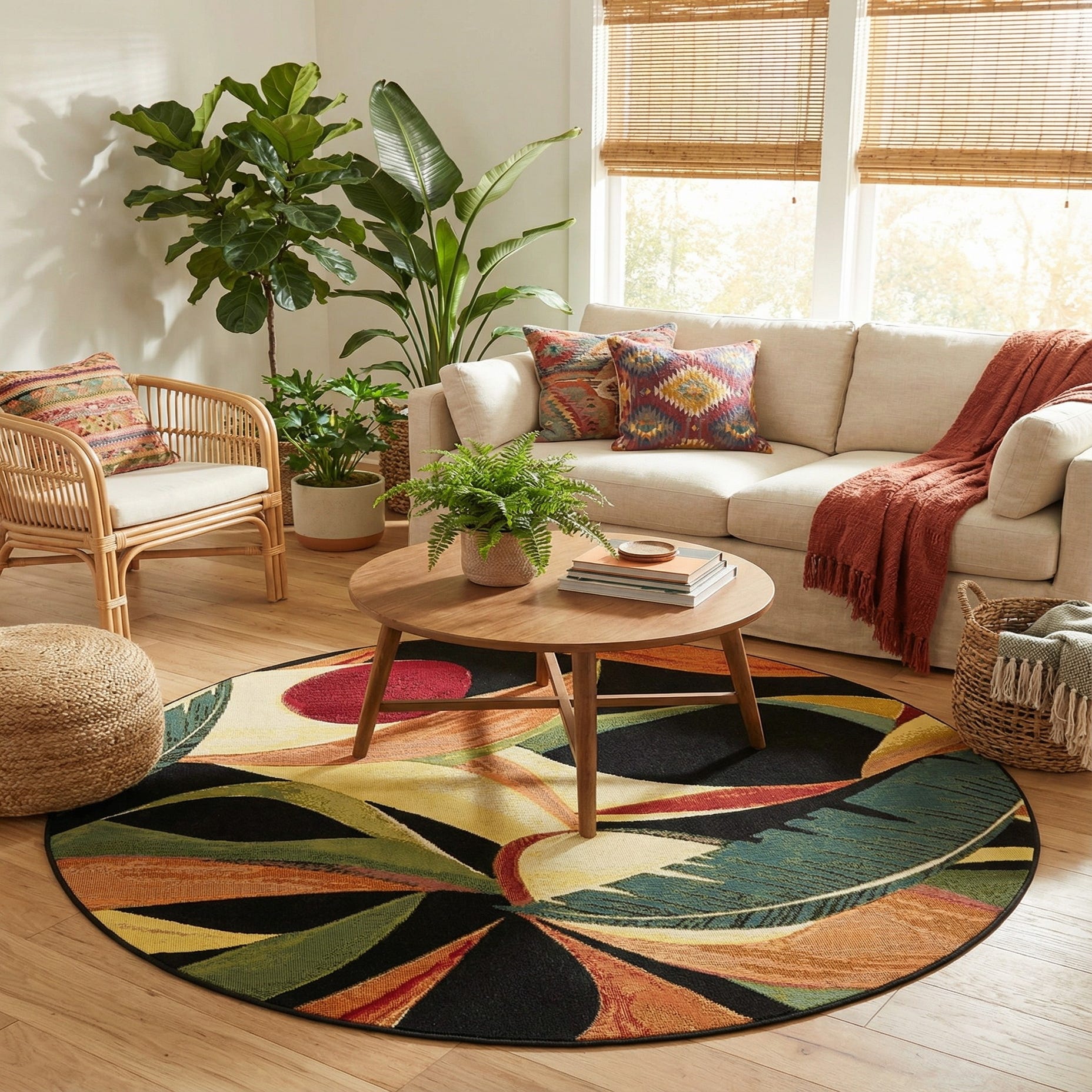 A 5' round multi-colored modern floral rug with large tropical leaves in green, yellow, orange, and red on a black background.