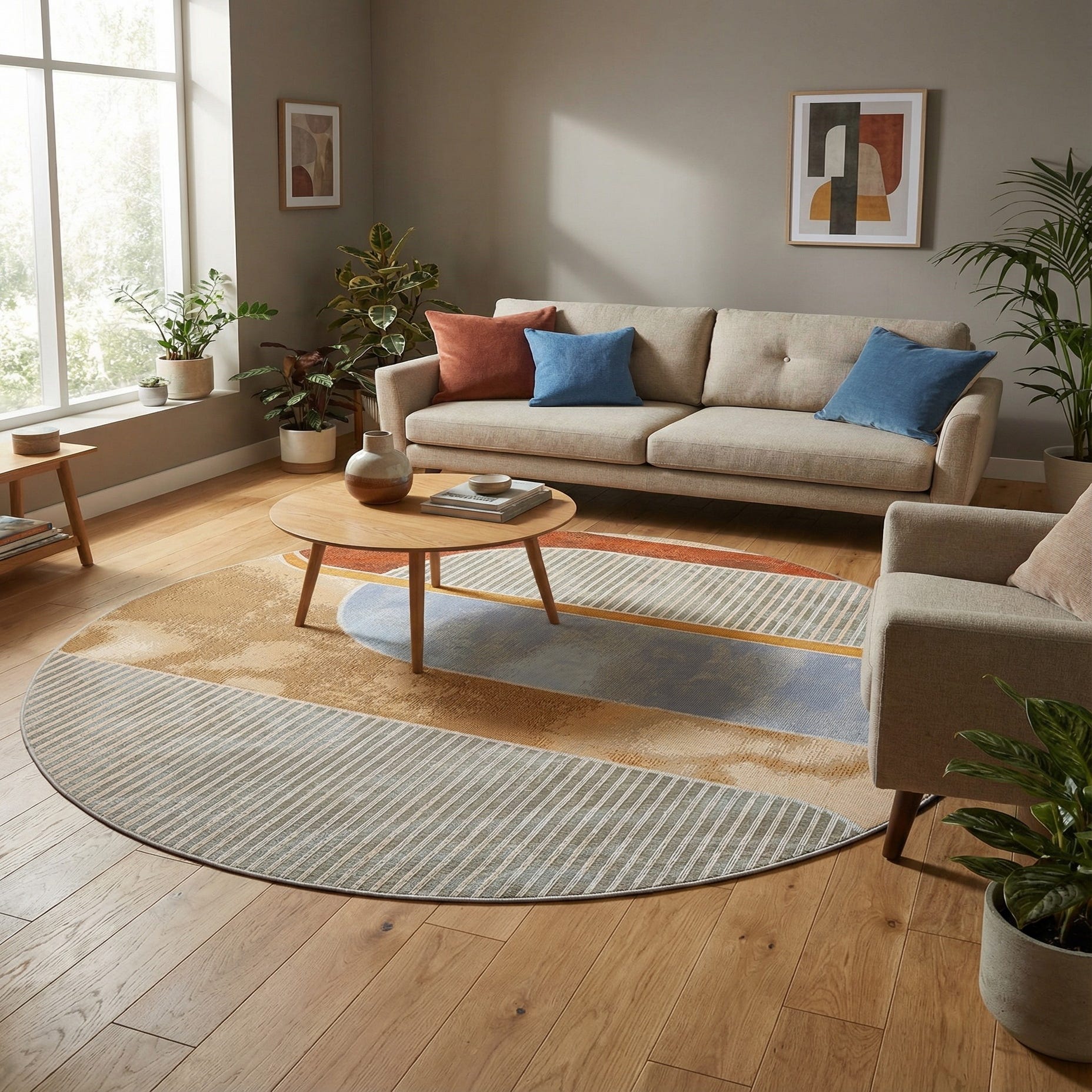 A 5' 3 x 5' 3 round multi-colored abstract rug with contemporary shapes and patterns, suitable for a patio.