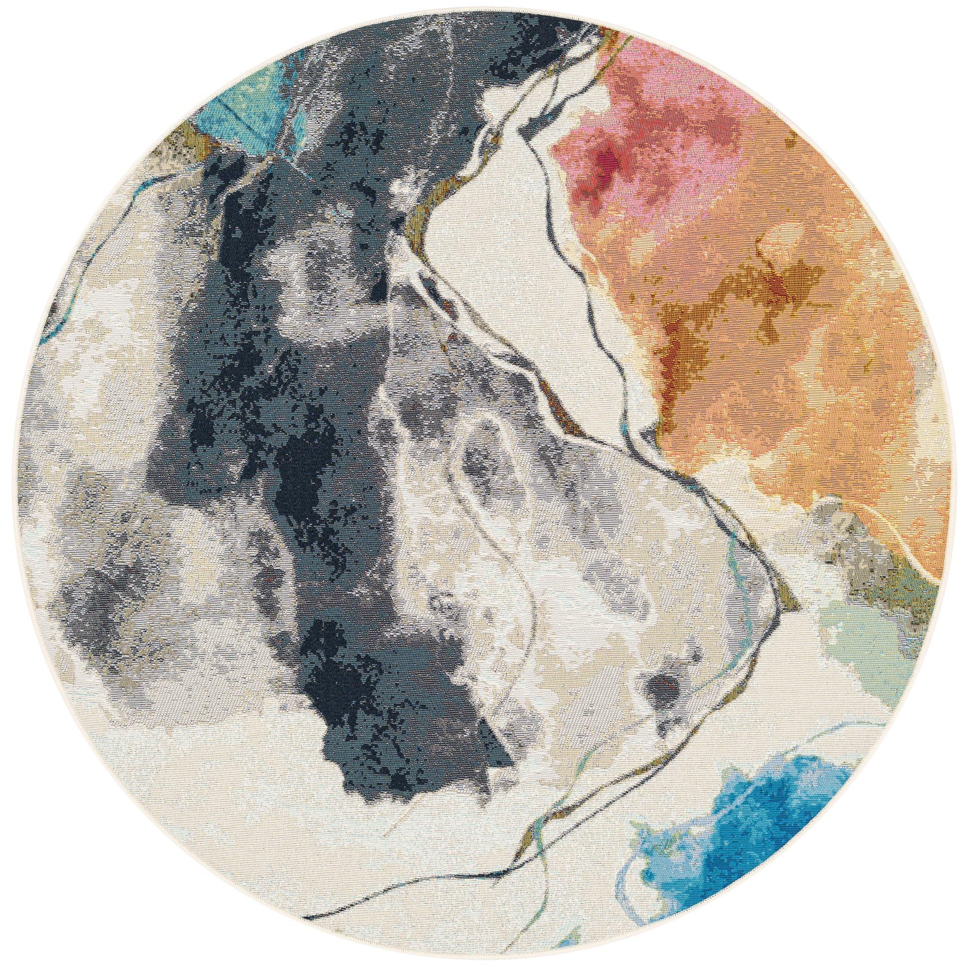 A 5' 3 round multi-colored abstract rug with shades of blue, orange, pink, and grey on a light background, suitable for indoor/outdoor use.