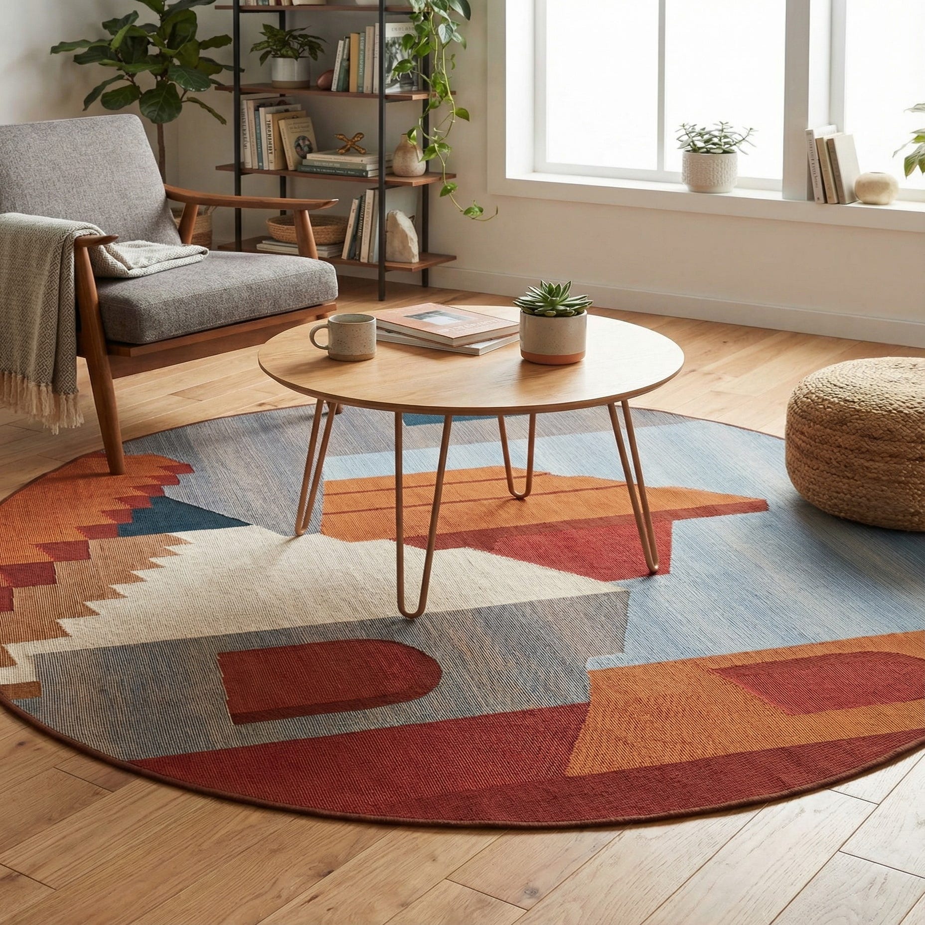 A 5' round multi-colored Southwestern abstract rug featuring geometric shapes resembling buildings and steps in shades of orange, red, blue, and cream.