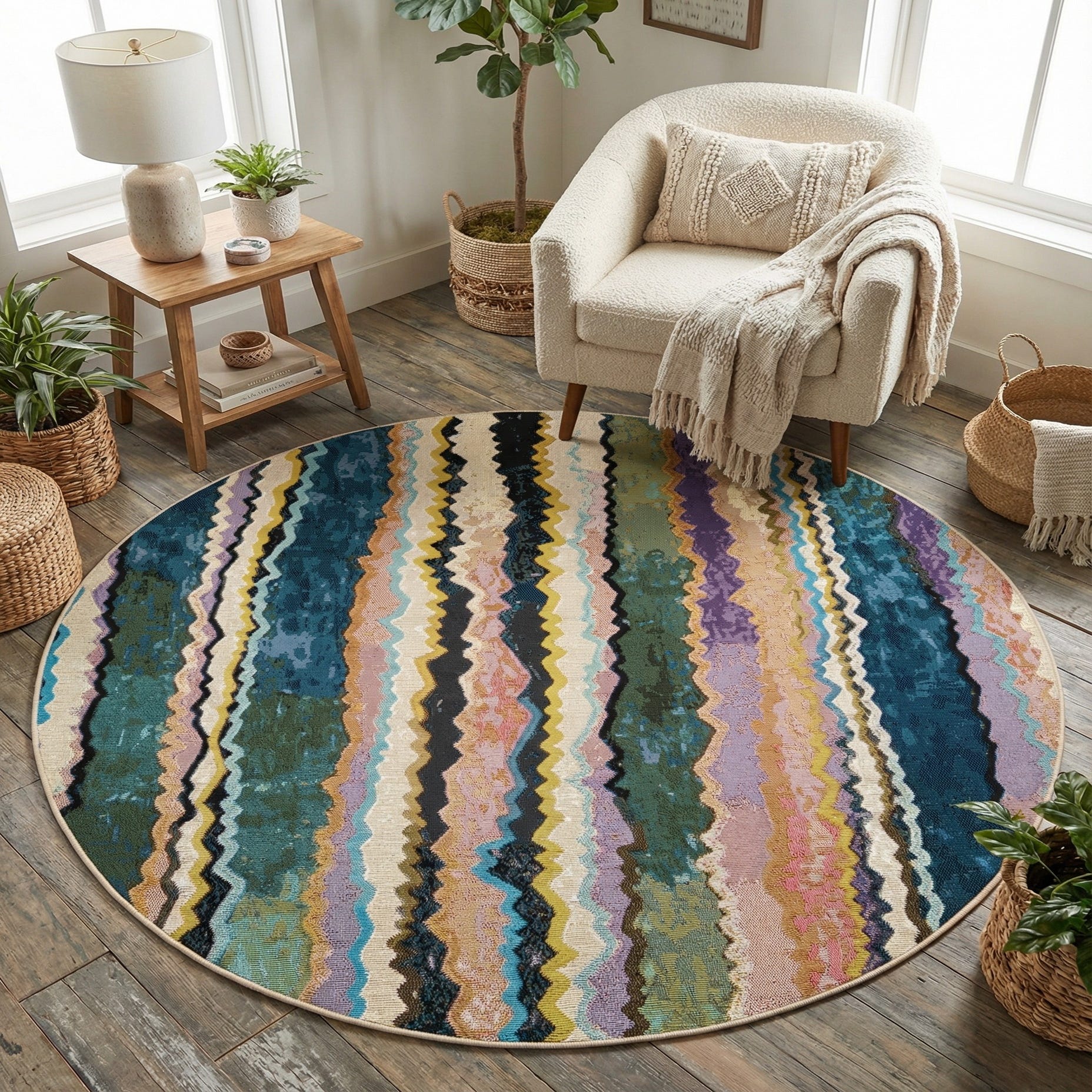 A 5' round multi-colored abstract rug with wavy horizontal stripes in various shades of blue, green, purple, pink, and beige.