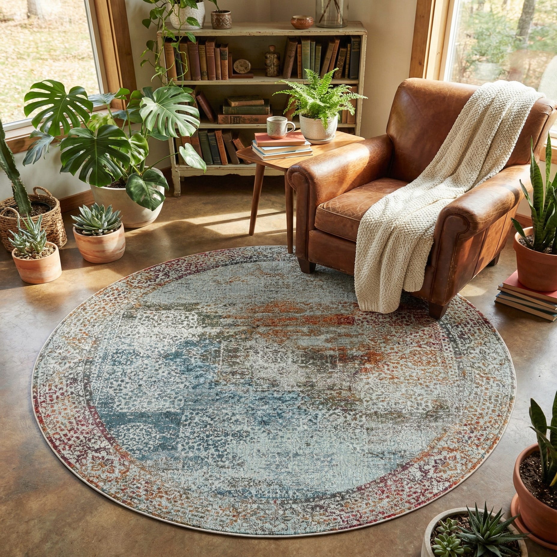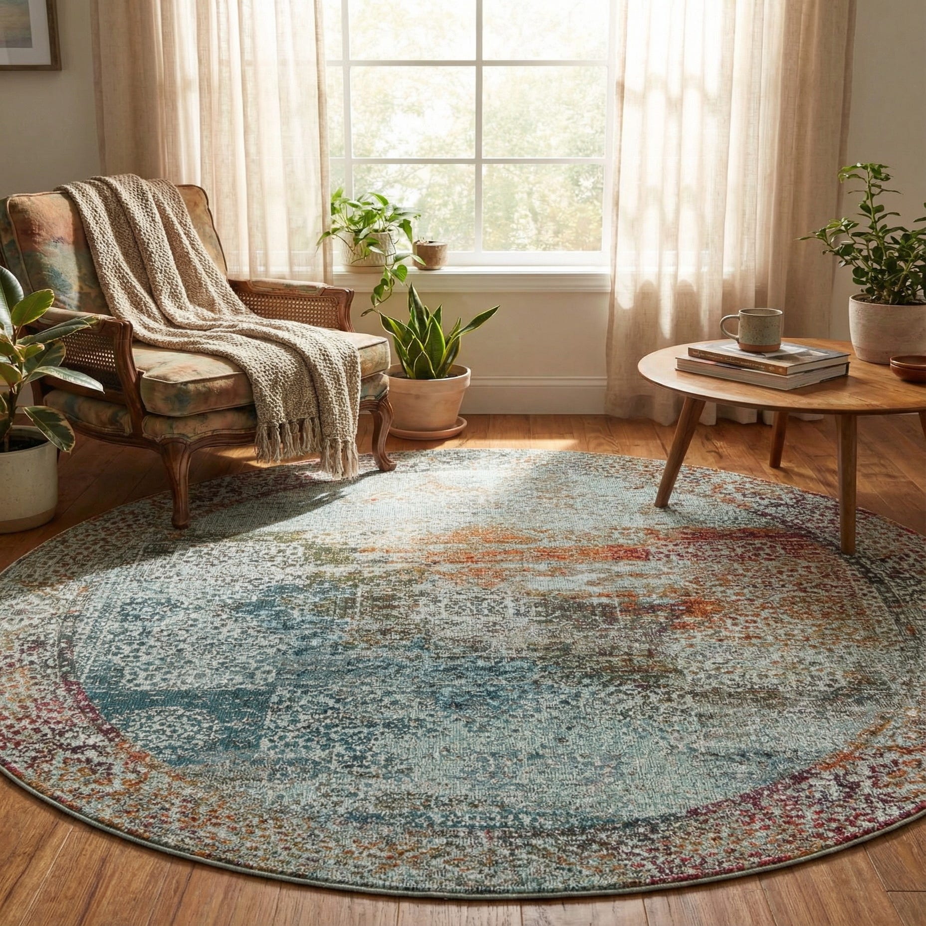 This round design works well beneath a circular dining table, as an anchor for a cozy seating area, or centered in a bedroom to add color without overwhelming the space. Its mixed palette pairs easily with warm wood tones, neutral upholstery, or eclectic accessories, making it a versatile choice for transitional, bohemian, or contemporary interiors.