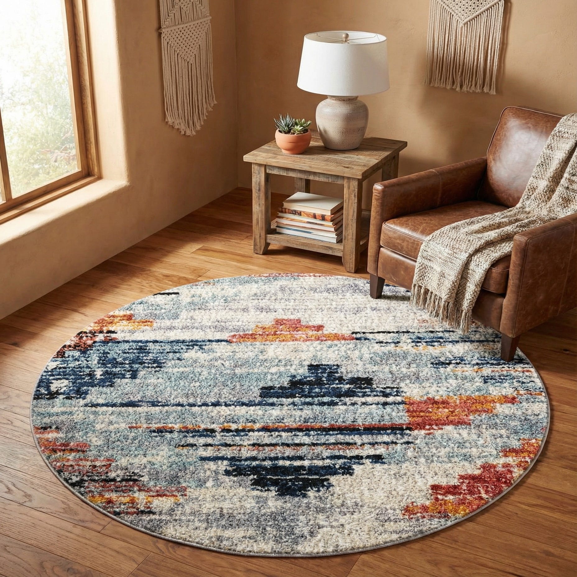 This rug works well in contemporary, transitional, or eclectic interiors. Use it to anchor a round coffee table in a living room, define a small seating nook, add warmth to an entryway, or layer beneath a bedside area in a bedroom. Pair with light oak or walnut furniture and neutral upholstery for a calm, balanced scheme, or bring out the rust and navy accents with warm metals and patterned throw pillows for a more vibrant look.