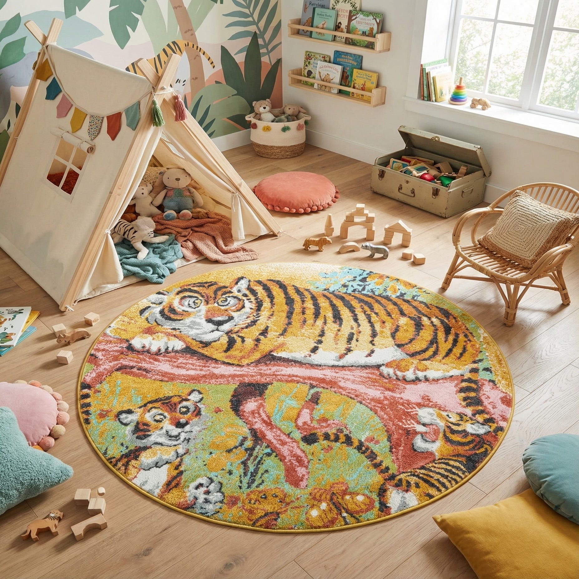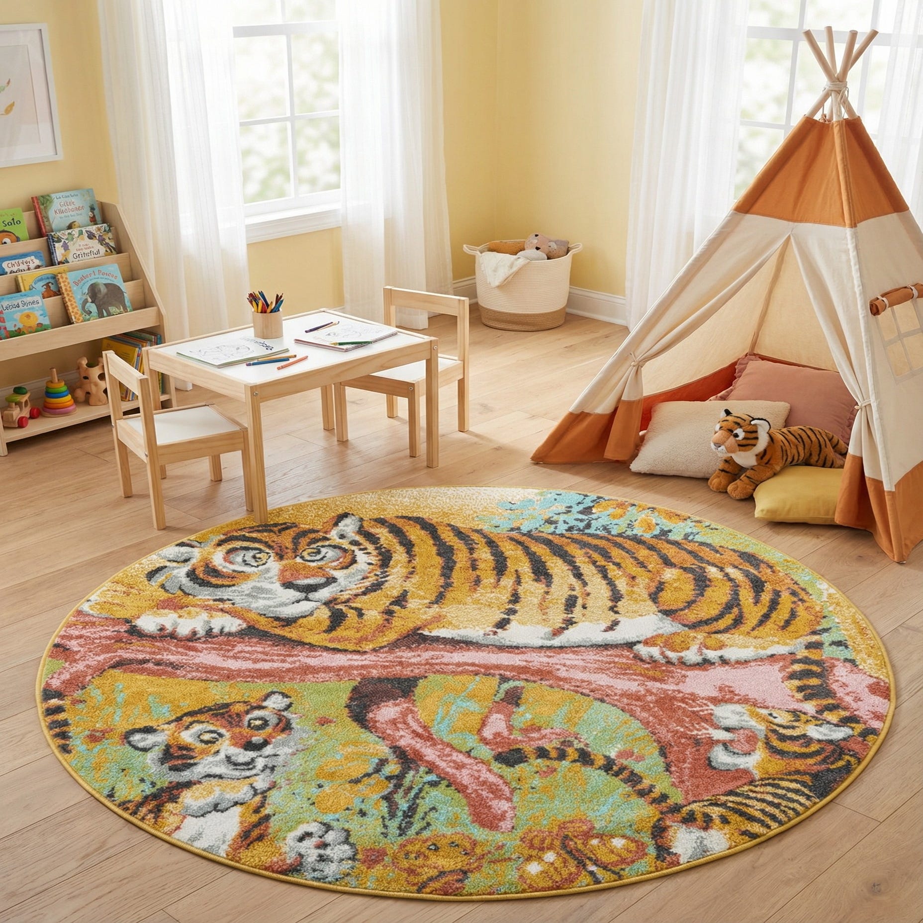 5' 1 x 5' 1 Tiger Whimsy Kids Round Rug