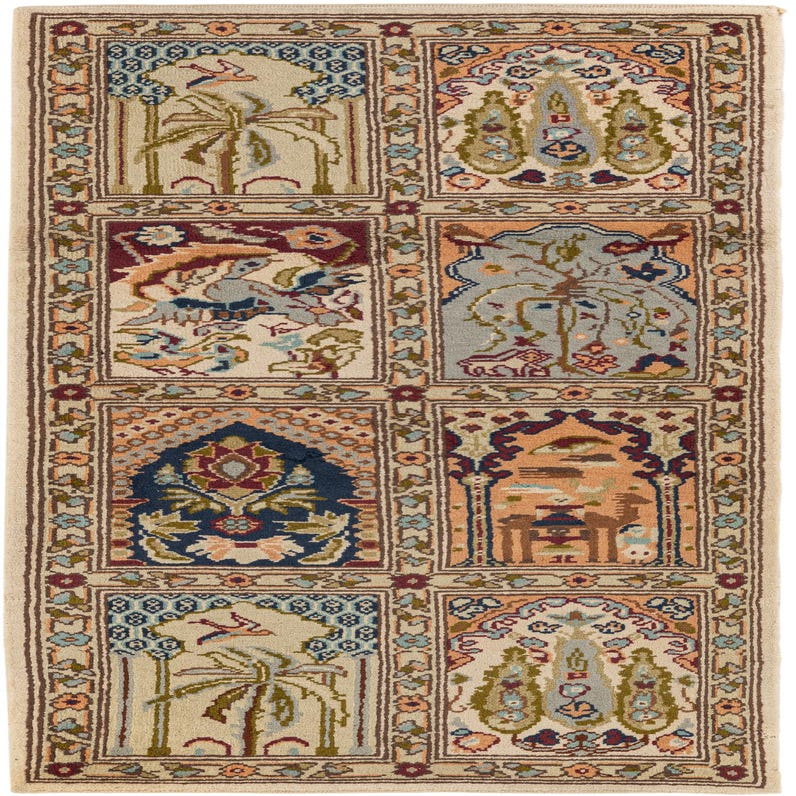 Primary color is Multi. Colors in this rug include: Multi, Light Blue, Navy Blue, Peach, Red, Green, Gray, Brown, Blue, Beige.